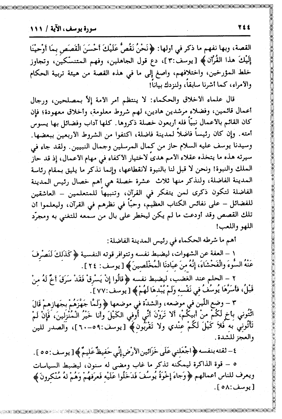 القصة، وبها نفهم ما ذكر في أولها: نَحْنُ نَقُصُّ عَلَيْكَ أَحْسَنَ الْقَصَصِ بِما أَوْحَيْنا إِلَيْكَ هذَا الْقُرْآنَ [يوسف: 3] ، دع قول الجاهلين، وفهم المتنسّكين، وتجاوز خلط المؤرخين، واختلافهم، واصغ إلى ما في هذه القصة من هيئة تربية الحكام والأمراء، كما أشرنا سابقا، ولنزدك بيانا! قال علماء الأخلاق والحكماء: لا ينتظم أمر الأمة إلّا بمصلحين، ورجال أعمال قائمين، وفضلاء مرشدين هادين، لهم شروط معلومة، وأخلاق معهودة فإن كان القائم بالأعمال نبيّا فله أربعون خصلة ذكروها. كلها آداب وفضائل بها يسوس أمته. وإن كان رئيسا فاضلا لمدينة فاضلة، اكتفوا من الشروط الأربعين ببعضها.