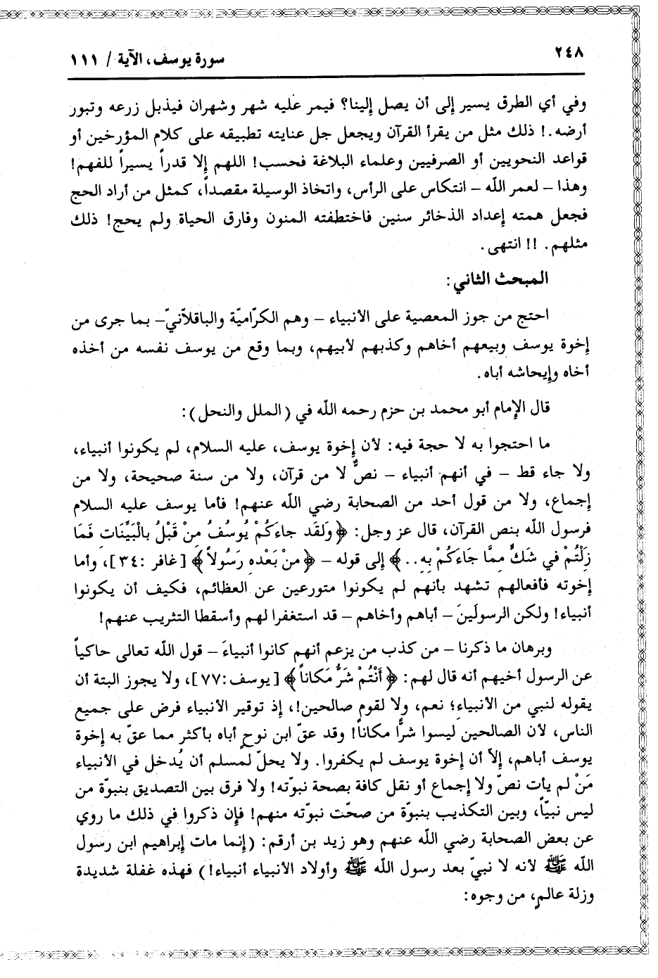 ما احتجوا به لا حجة فيه: لأن إخوة يوسف، عليه السلام، لم يكونوا أنبياء، ولا جاء قط- في أنهم أنبياء- نصّ لا من قرآن، ولا من سنة صحيحة، ولا من إجماع، ولا من قول أحد من الصحابة رضي الله عنهم! فأما يوسف عليه السلام فرسول الله بنص القرآن، قال عز وجل: وَلَقَدْ جاءَكُمْ يُوسُفُ مِنْ قَبْلُ بِالْبَيِّناتِ فَما زِلْتُمْ فِي شَكٍّ مِمَّا جاءَكُمْ بِهِ.. إلى قوله- مِنْ بَعْدِهِ رَسُولًا [غافر: 34] ، وأما إخوته فأفعالهم تشهد بأنهم لم يكونوا متورعين عن العظائم، فكيف أن يكونوا أنبياء! ولكن الرسولين- أباهم وأخاهم- قد استغفرا لهم وأسقطا التثريب عنهم! وبرهان ما ذكرنا- من كذب من يزعم أنهم كانوا أنبياء- قول الله تعالى حاكيا عن الرسول أخيهم أنه قال لهم: أَنْتُمْ شَرٌّ مَكاناً [يوسف: 77] ، ولا يجوز البتة أن يقوله لنبي من الأنبياء نعم، ولا لقوم صالحين!، إذ توقير الأنبياء فرض على جميع الناس، لأن الصالحين ليسوا شرّا مكانا! وقد عقّ ابن نوح أباه بأكثر مما عقّ به إخوة يوسف أباهم، إلّا أن إخوة يوسف لم يكفروا. ولا يحلّ لمسلم أن يدخل في الأنبياء من لم يأت نصّ ولا إجماع أو نقل كافة بصحة نبوّته! ولا فرق بين التصديق بنبوّة من ليس نبيّا، وبين التكذيب بنبوّة من صحّت نبوّته منهم! فإن ذكروا في ذلك ما روي عن بعض الصحابة رضي الله عنهم وهو زيد بن أرقم: (إنما مات إبراهيم ابن رسول الله صلى الله عليه وسلم لأنه لا نبيّ بعد رسول الله صلى الله عليه وسلم وأولاد الأنبياء أنبياء!) فهذه غفلة شديدة وزلة عالم، من وجوه: