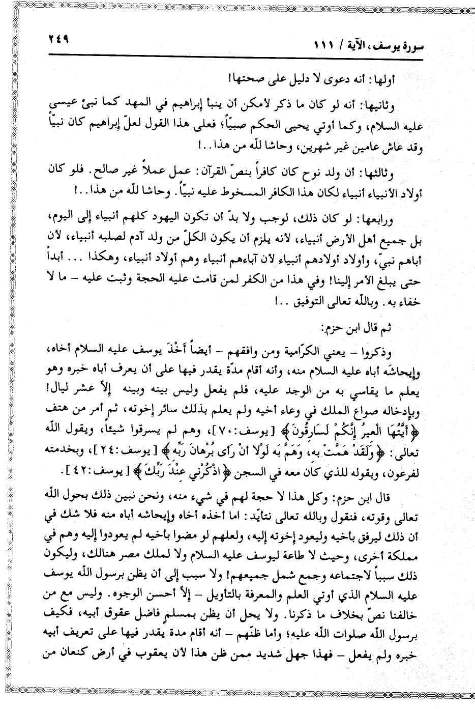 قال ابن حزم: وكل هذا لا حجة لهم في شيء منه، ونحن نبين ذلك بحول الله تعالى وقوته، فنقول وبالله تعالى نتأيّد: اما أخذه أخاه وإيحاشه أباه منه فلا شك في أن ذلك ليرفق بأخيه وليعود إخوته إليه، ولعلهم لو مضوا بأخيه لم يعودوا إليه وهم في مملكة أخرى، وحيث لا طاعة ليوسف عليه السلام ولا لملك مصر هنالك، وليكون ذلك سببا لاجتماعه وجمع شمل جميعهم! ولا سبب إلى أن يظن برسول الله يوسف عليه السلام الذي أوتي العلم والمعرفة بالتأويل- إلّا أحسن الوجوه. وليس مع من خالفنا نصّ بخلاف ما ذكرنا. ولا يحل أن يظن بمسلم فاضل عقوق أبيه، فكيف برسول الله صلوات الله عليه وأما ظنّهم- أنه أقام مدة يقدر فيها على تعريف أبيه خبره ولم يفعل- فهذا جهل شديد ممن ظن هذا لأن يعقوب في أرض كنعان من