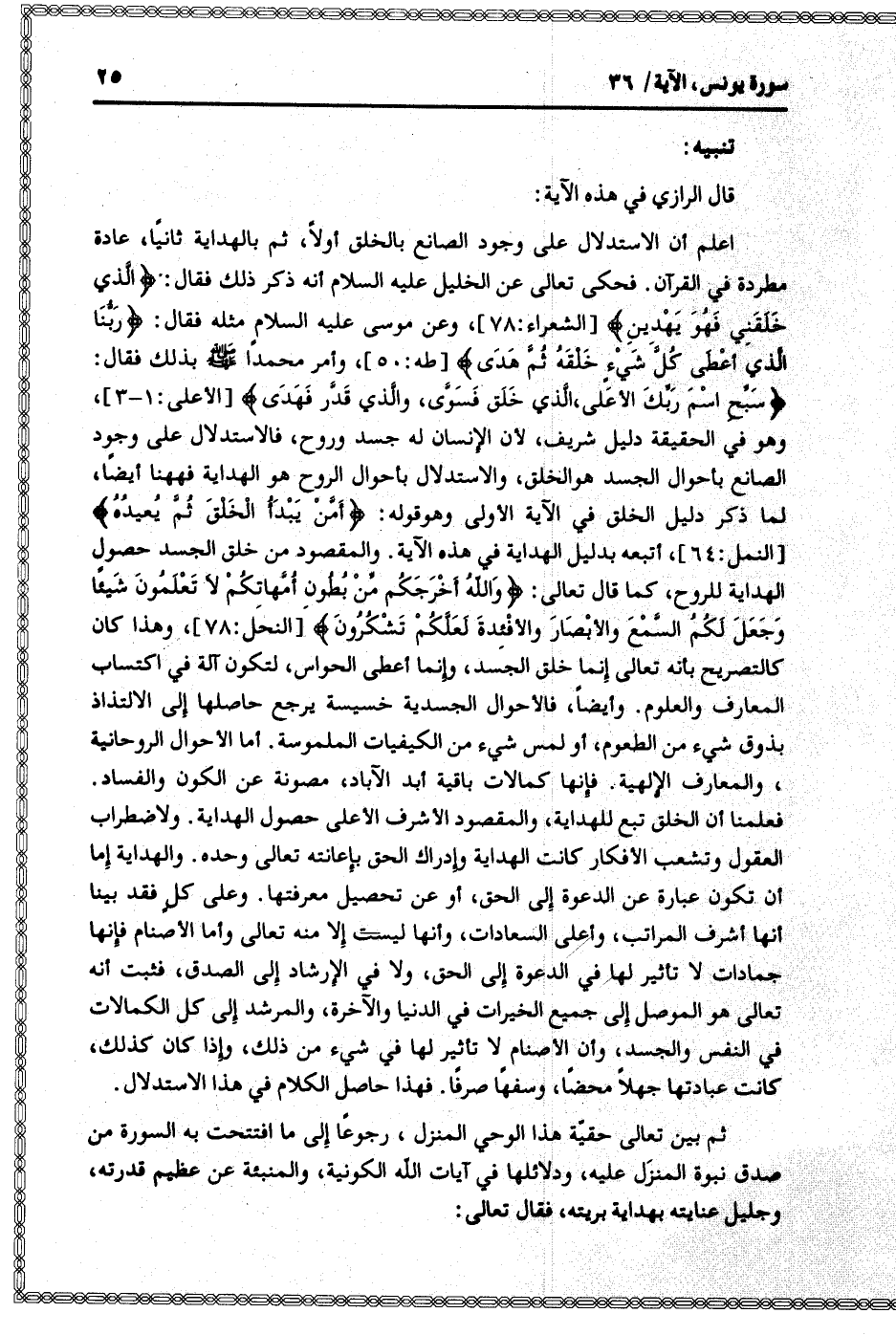 فعلمنا أن الخلق تبع للهداية، والمقصود الأشرف الأعلى حصول الهداية. ولاضطراب العقول وتشعب الأفكار كانت الهداية وإدراك الحق بإعانته تعالى وحده. والهداية إما أن تكون عبارة عن الدعوة إلى الحق، أو عن تحصيل معرفتها. وعلى كل فقد بينا أنها أشرف المراتب، وأعلى السعادات، وأنها ليست إلا منه تعالى وأما الأصنام فإنها جمادات لا تأثير لها في الدعوة إلى الحق، ولا في الإرشاد إلى الصدق، فثبت أنه تعالى هو الموصل إلى جميع الخيرات في الدنيا والآخرة، والمرشد إلى كل الكمالات في النفس والجسد، وأن الأصنام لا تأثير لها في شيء من ذلك، وإذا كان كذلك، كانت عبادتها جهلا محضا، وسفها صرفا. فهذا حاصل الكلام في هذا الاستدلال.