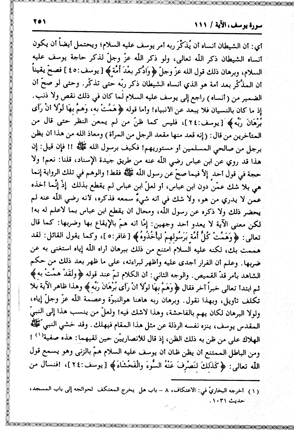 إذ ما كان بالنسيان فلا يبعد عن الأنبياء! وأما قوله هَمَّتْ بِهِ، وَهَمَّ بِها لَوْلا أَنْ رَأى بُرْهانَ رَبِّهِ [يوسف: 24] ، فليس كما ظنّ من لم يمعن النظر حتى قال من المتأخرين من قال: (إنه قعد منها مقعد الرجل من المرأة) ومعاذ الله من هذا أن يظن برجل من صالحي المسلمين أو مستوريهم! فكيف برسول الله صلى الله عليه وسلم!! فإن قيل: إن هذا قد روي عن ابن عباس رضي الله عنه من طريق جيدة الإسناد، قلنا: نعم! ولا حجة في قول أحد إلّا فيما صحّ عن رسول الله صلى الله عليه وسلم فقط! والوهم في تلك الرواية إنما هي بلا شك عمّن دون ابن عباس، أو لعلّ ابن عباس لم يقطع بذلك إذ إنّما أخذه عمن لا يدري من هو، ولا شك في أنه شيء سمعه فذكره، لأنه رضي الله عنه لم يحضر ذلك ولا ذكره عن رسول الله، ومحال أن يقطع ابن عباس بما لا علم له به! لكن معنى الآية لا يعدو أحد وجهين: إمّا أنه همّ بالإيقاع بها وضربها: كما قال تعالى: وَهَمَّتْ كُلُّ أُمَّةٍ بِرَسُولِهِمْ لِيَأْخُذُوهُ [غافر: 5] ، وكما يقول القائل: لقد هممت بك، لكنه عليه السلام امتنع من ذلك ببرهان أراه الله إياه استغنى به عن ضربها. وعلم أن الفرار أجدى عليه وأظهر لبراءته، على ما ظهر بعد ذلك من حكم الشاهد بأمر قدّ القميص. والوجه الثاني: أن الكلام تمّ عند قوله وَلَقَدْ هَمَّتْ بِهِ ثم ابتدأ تعالى خبرا آخر فقال وَهَمَّ بِها لَوْلا أَنْ رَأى بُرْهانَ رَبِّهِ وهذا ظاهر الآية بلا تكلف تأويل، وبهذا نقول. وبرهان ربه هاهنا هو النبوّة وعصمة الله عزّ وجلّ إياه، ولولا البرهان لكان يهم بالفاحشة، وهذا لا شك فيه! ولعلّ من ينسب هذا إلى النبيّ المقدس يوسف، ينزه نفسه الرذلة عن مثل هذا المقام فيهلك. وقد خشي النبيّ صلى الله عليه وسلم الهلاك على من ظن به ذلك الظن، إذ قال للأنصاريين حين لقيهما: هذه صفية «1» ! ومن الباطل الممتنع أن يظن ظان أن يوسف عليه السلام همّ بالزنى وهو يسمع قول الله تعالى: كَذلِكَ لِنَصْرِفَ عَنْهُ السُّوءَ وَالْفَحْشاءَ [يوسف: 24] ،! فنسأل من