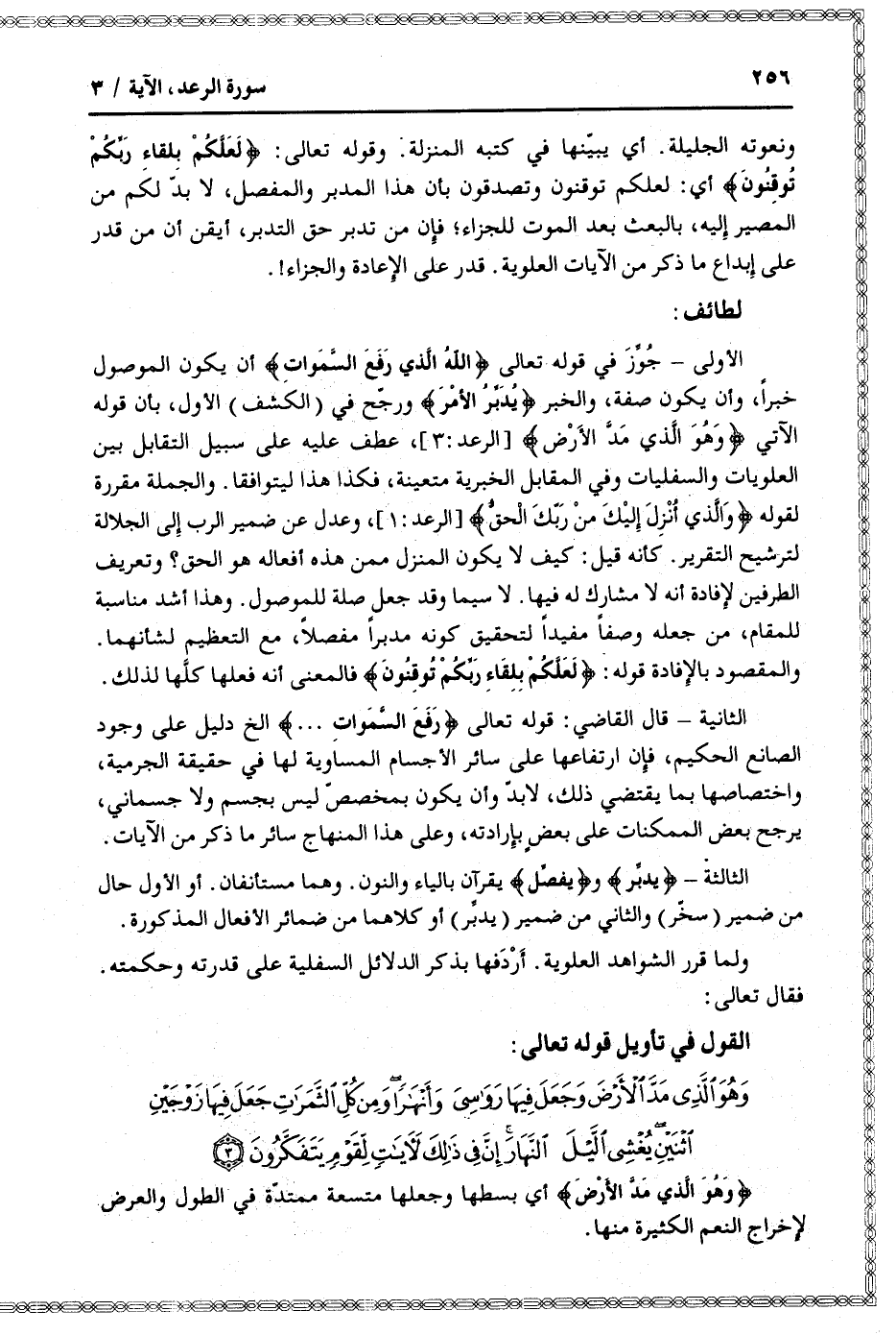 الأولى- جوّز في قوله تعالى اللَّهُ الَّذِي رَفَعَ السَّماواتِ أن يكون الموصول خبرا، وأن يكون صفة، والخبر يُدَبِّرُ الْأَمْرَ ورجّح في (الكشف) الأول، بأن قوله الآتي وَهُوَ الَّذِي مَدَّ الْأَرْضَ [الرعد: 3] ، عطف عليه على سبيل التقابل بين العلويات والسفليات وفي المقابل الخبرية متعينة، فكذا هذا ليتوافقا. والجملة مقررة لقوله وَالَّذِي أُنْزِلَ إِلَيْكَ مِنْ رَبِّكَ الْحَقُّ [الرعد: 1] ، وعدل عن ضمير الرب إلى الجلالة لترشيح التقرير. كأنه قيل: كيف لا يكون المنزل ممن هذه أفعاله هو الحق؟ وتعريف الطرفين لإفادة أنه لا مشارك له فيها. لا سيما وقد جعل صلة للموصول. وهذا أشد مناسبة للمقام، من جعله وصفا مفيدا لتحقيق كونه مدبرا مفصلا، مع التعظيم لشأنهما.
