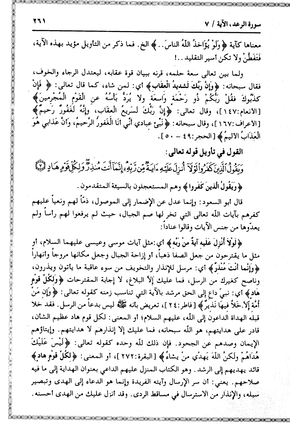وَيَقُولُ الَّذِينَ كَفَرُوا لَوْلا أُنْزِلَ عَلَيْهِ آيَةٌ مِنْ رَبِّهِ إِنَّما أَنْتَ مُنْذِرٌ وَلِكُلِّ قَوْمٍ هادٍ (7)