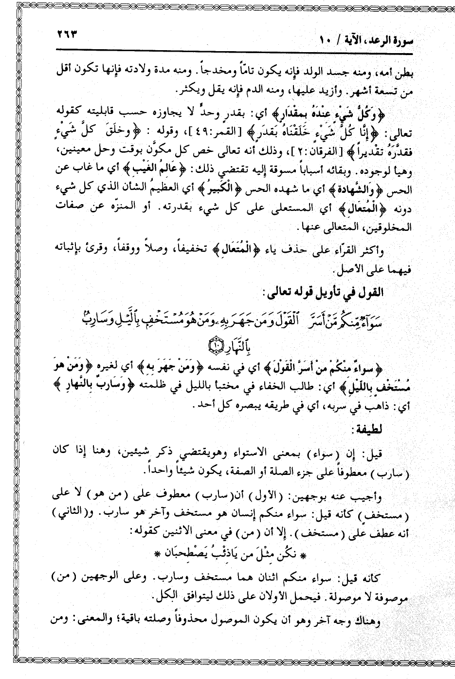 سَواءٌ مِنْكُمْ مَنْ أَسَرَّ الْقَوْلَ وَمَنْ جَهَرَ بِهِ وَمَنْ هُوَ مُسْتَخْفٍ بِاللَّيْلِ وَسارِبٌ بِالنَّهارِ (10)