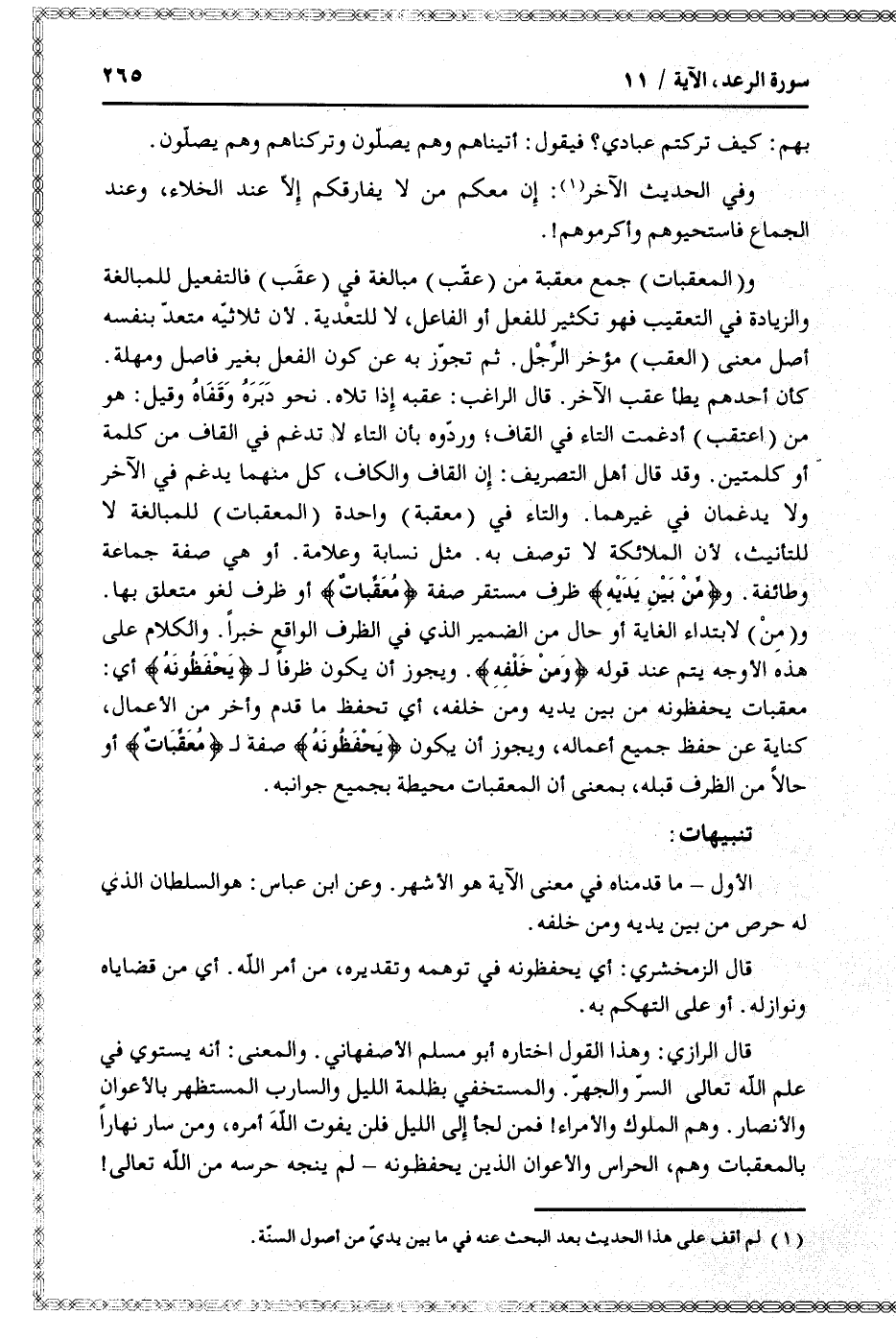 كأن أحدهم يطأ عقب الآخر. قال الراغب: عقبه إذا تلاه. نحو دبره وقفاه وقيل: هو من (اعتقب) أدغمت التاء في القاف وردّوه بأن التاء لا تدغم في القاف من كلمة أو كلمتين. وقد قال أهل التصريف: إن القاف والكاف، كل منهما يدغم في الآخر ولا يدغمان في غيرهما. والتاء في (معقبة) واحدة (المعقبات) للمبالغة لا للتأنيث، لأن الملائكة لا توصف به. مثل نسابة وعلامة. أو هي صفة جماعة وطائفة. ومِنْ بَيْنِ يَدَيْهِ ظرف مستقر صفة مُعَقِّباتٌ أو ظرف لغو متعلق بها.