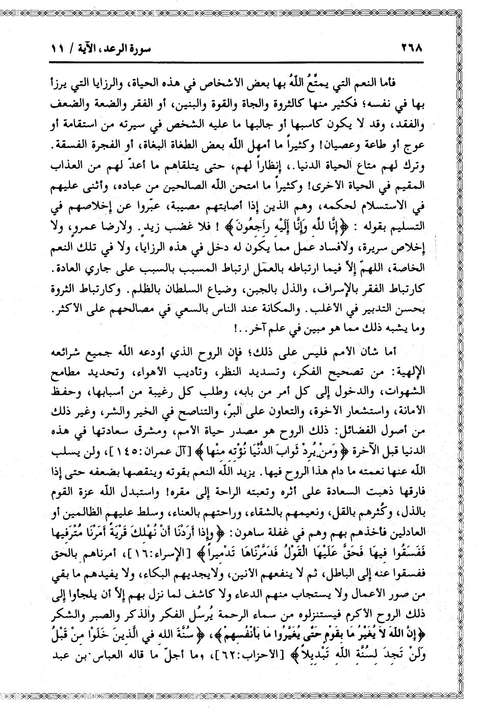 أما شأن الأمم فليس على ذلك فإن الروح الذي أودعه الله جميع شرائعه الإلهية: من تصحيح الفكر، وتسديد النظر، وتأديب الأهواء، وتحديد مطامح الشهوات، والدخول إلى كل أمر من بابه، وطلب كل رغيبة من أسبابها، وحفظ الأمانة، واستشعار الأخوة، والتعاون على البرّ، والتناصح في الخير والشر، وغير ذلك من أصول الفضائل: ذلك الروح هو مصدر حياة الأمم، ومشرق سعادتها في هذه الدنيا قبل الآخرة وَمَنْ يُرِدْ ثَوابَ الدُّنْيا نُؤْتِهِ مِنْها [آل عمران: 145] ، ولن يسلب الله عنها نعمته ما دام هذا الروح فيها. يزيد الله النعم بقوته وينقصها بضعفه حتى إذا فارقها ذهبت السعادة على أثره وتبعته الراحة إلى مقره! واستبدل الله عزة القوم بالذل، وكثرهم بالقل، ونعيمهم بالشقاء، وراحتهم بالعناء، وسلط عليهم الظالمين أو العادلين فأخذهم بهم وهم في غفلة ساهون: وَإِذا أَرَدْنا أَنْ نُهْلِكَ قَرْيَةً أَمَرْنا مُتْرَفِيها فَفَسَقُوا فِيها فَحَقَّ عَلَيْهَا الْقَوْلُ فَدَمَّرْناها تَدْمِيراً