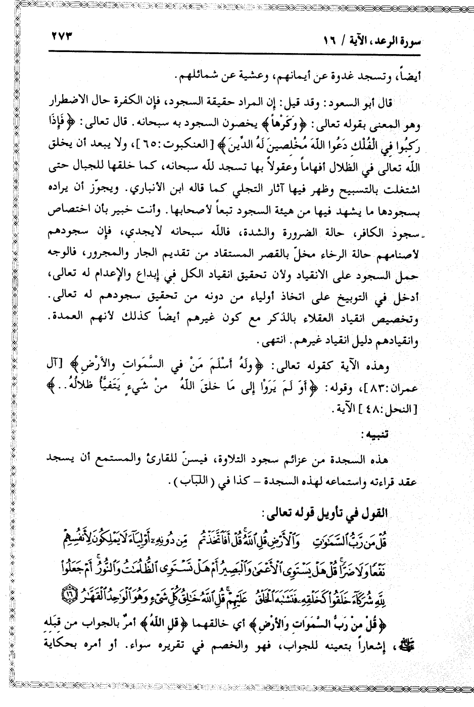 قُلْ مَنْ رَبُّ السَّماواتِ وَالْأَرْضِ قُلِ اللَّهُ قُلْ أَفَاتَّخَذْتُمْ مِنْ دُونِهِ أَوْلِياءَ لا يَمْلِكُونَ لِأَنْفُسِهِمْ نَفْعاً وَلا ضَرًّا قُلْ هَلْ يَسْتَوِي الْأَعْمى وَالْبَصِيرُ أَمْ هَلْ تَسْتَوِي الظُّلُماتُ وَالنُّورُ أَمْ جَعَلُوا لِلَّهِ شُرَكاءَ خَلَقُوا كَخَلْقِهِ فَتَشابَهَ الْخَلْقُ عَلَيْهِمْ قُلِ اللَّهُ خالِقُ كُلِّ شَيْءٍ وَهُوَ الْواحِدُ الْقَهَّارُ (16)