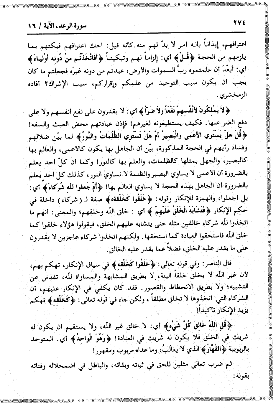 لا يَمْلِكُونَ لِأَنْفُسِهِمْ نَفْعاً وَلا ضَرًّا أي: لا يقدرون على نفع أنفسهم ولا على دفع الضر عنها. فكيف يستطيعونه لغيرهم! فإذن عبادتهم محض العبث والسفه! قُلْ هَلْ يَسْتَوِي الْأَعْمى وَالْبَصِيرُ أَمْ هَلْ تَسْتَوِي الظُّلُماتُ وَالنُّورُ لما بيّن ضلالهم وفساد رأيهم في الحجة المذكورة، بيّن أن الجاهل بها يكون كالأعمى، والعالم بها كالبصير، والجهل بمثلها كالظلمات، والعلم بها كالنور! وكما أن كلّ أحد يعلم بالضرورة أن الأعمى لا يساوي البصير والظلمة لا تساوي النور، كذلك كل أحد يعلم بالضرورة أن الجاهل بهذه الحجة لا يساوي العالم بها! أَمْ جَعَلُوا لِلَّهِ شُرَكاءَ أي: