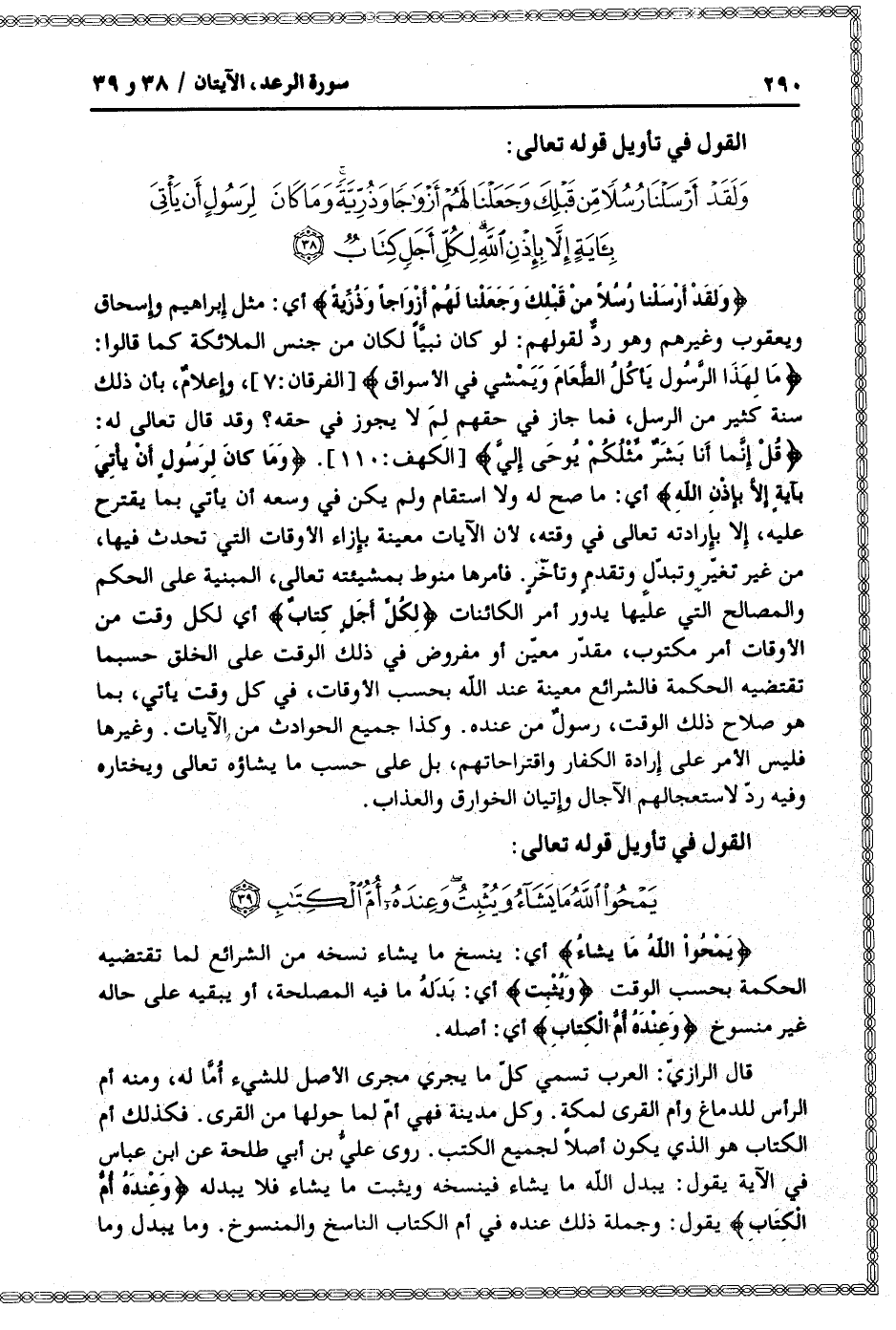 قال الرازيّ: العرب تسمي كلّ ما يجري مجرى الأصل للشيء أُمّا له، ومنه أم الرأس للدماغ وأم القرى لمكة. وكل مدينة فهي أمّ لما حولها من القرى. فكذلك أم الكتاب هو الذي يكون أصلا لجميع الكتب. روى عليّ بن أبي طلحة عن ابن عباس في الآية يقول: يبدل الله ما يشاء فينسخه ويثبت ما يشاء فلا يبدله وَعِنْدَهُ أُمُّ الْكِتابِ يقول: وجملة ذلك عنده في أم الكتاب الناسخ والمنسوخ. وما يبدل وما