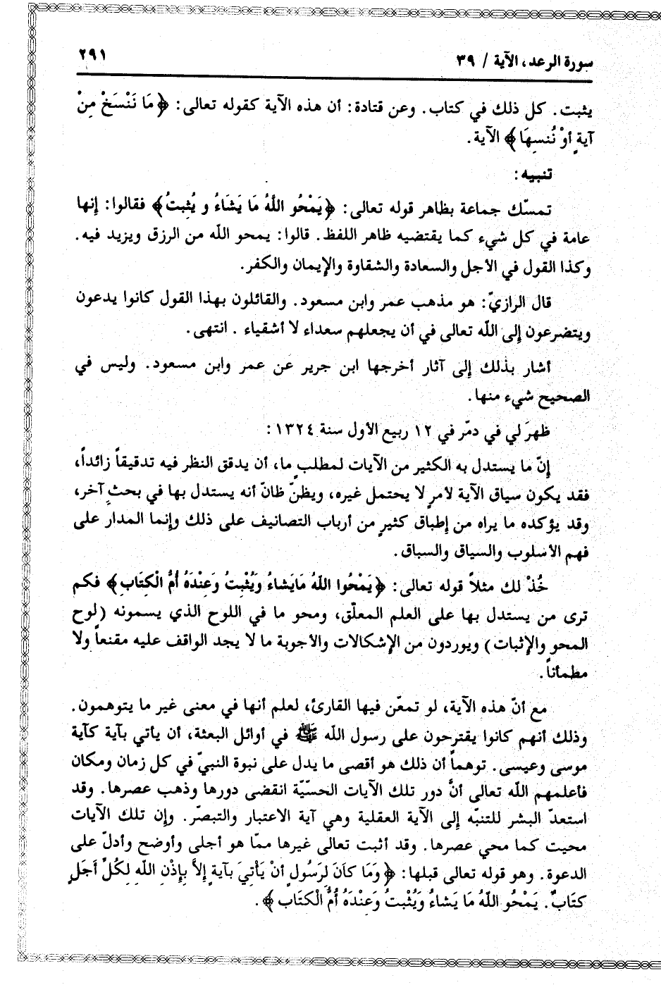 خذ لك مثلا قوله تعالى: يَمْحُوا اللَّهُ ما يَشاءُ وَيُثْبِتُ وَعِنْدَهُ أُمُّ الْكِتابِ فكم ترى من يستدل بها على العلم المعلّق، ومحو ما في اللوح الذي يسمونه (لوح المحو والإثبات) ويوردون من الإشكالات والأجوبة ما لا يجد الواقف عليه مقنعا ولا مطمأنا.