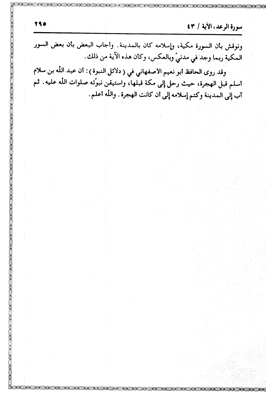 وقد روى الحافظ أبو نعيم الأصفهاني في (دلائل النبوة) : أن عبد الله بن سلام أسلم قبل الهجرة، حيث رحل إلى مكة قبلها، واستيقن نبوّته صلوات الله عليه. ثم آب إلى المدينة وكتم إسلامه إلى أن كانت الهجرة. والله أعلم.