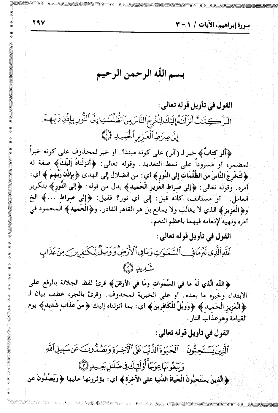 الر كِتابٌ أَنْزَلْناهُ إِلَيْكَ لِتُخْرِجَ النَّاسَ مِنَ الظُّلُماتِ إِلَى النُّورِ بِإِذْنِ رَبِّهِمْ إِلى صِراطِ الْعَزِيزِ الْحَمِيدِ (1)