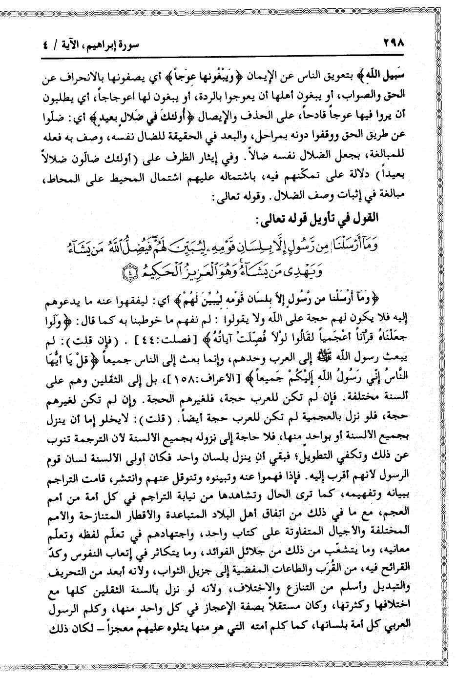 وَما أَرْسَلْنا مِنْ رَسُولٍ إِلاَّ بِلِسانِ قَوْمِهِ لِيُبَيِّنَ لَهُمْ فَيُضِلُّ اللَّهُ مَنْ يَشاءُ وَيَهْدِي مَنْ يَشاءُ وَهُوَ الْعَزِيزُ الْحَكِيمُ (4)