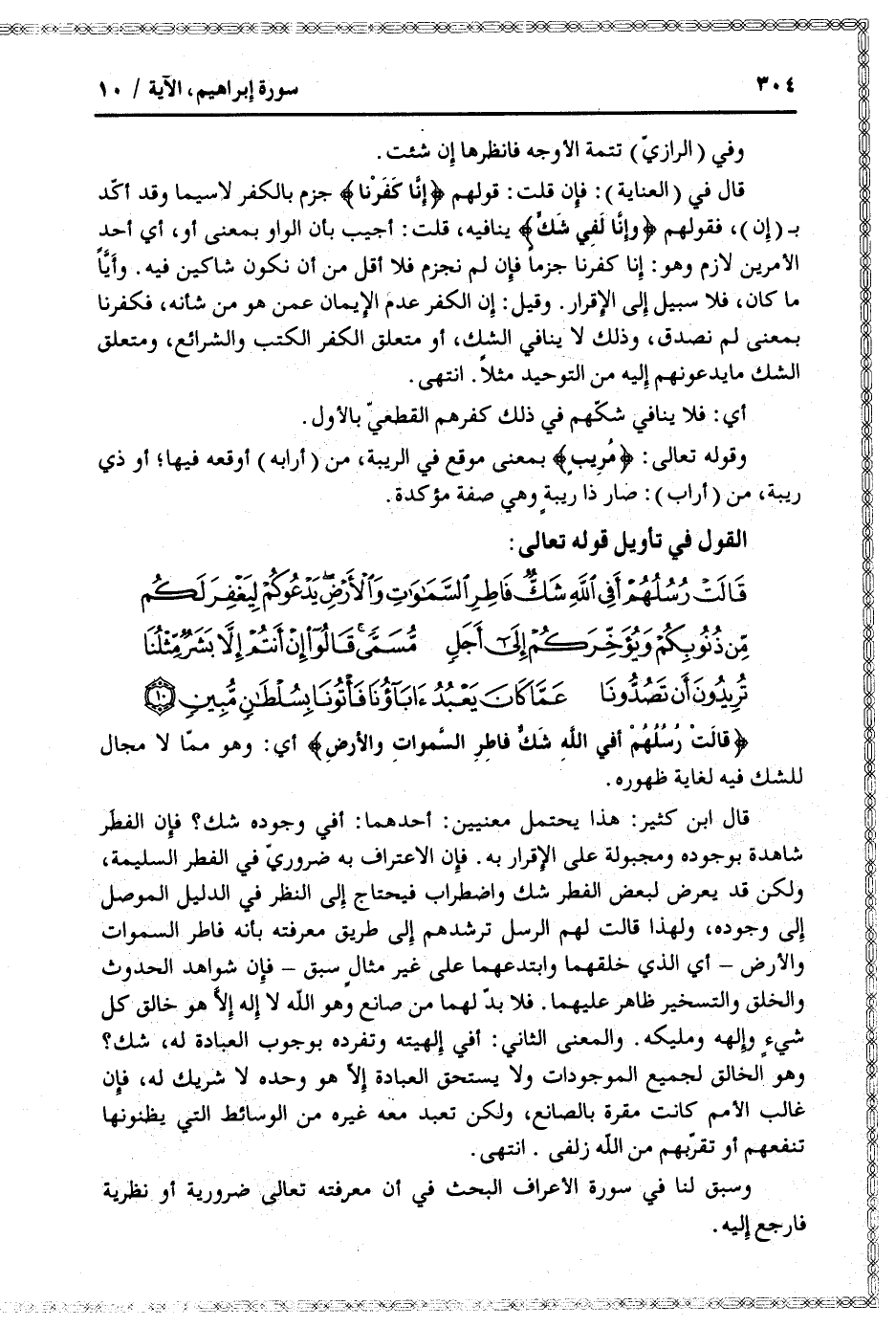قال ابن كثير: هذا يحتمل معنيين: أحدهما: أفي وجوده شك؟ فإن الفطر شاهدة بوجوده ومجبولة على الإقرار به. فإن الاعتراف به ضروريّ في الفطر السليمة، ولكن قد يعرض لبعض الفطر شك واضطراب فيحتاج إلى النظر في الدليل الموصل إلى وجوده، ولهذا قالت لهم الرسل ترشدهم إلى طريق معرفته بأنه فاطر السموات والأرض- أي الذي خلقهما وابتدعهما على غير مثال سبق- فإن شواهد الحدوث والخلق والتسخير ظاهر عليهما. فلا بدّ لهما من صانع وهو الله لا إله إلّا هو خالق كل شيء وإلهه ومليكه. والمعنى الثاني: أفي إلهيته وتفرده بوجوب العبادة له، شك؟
