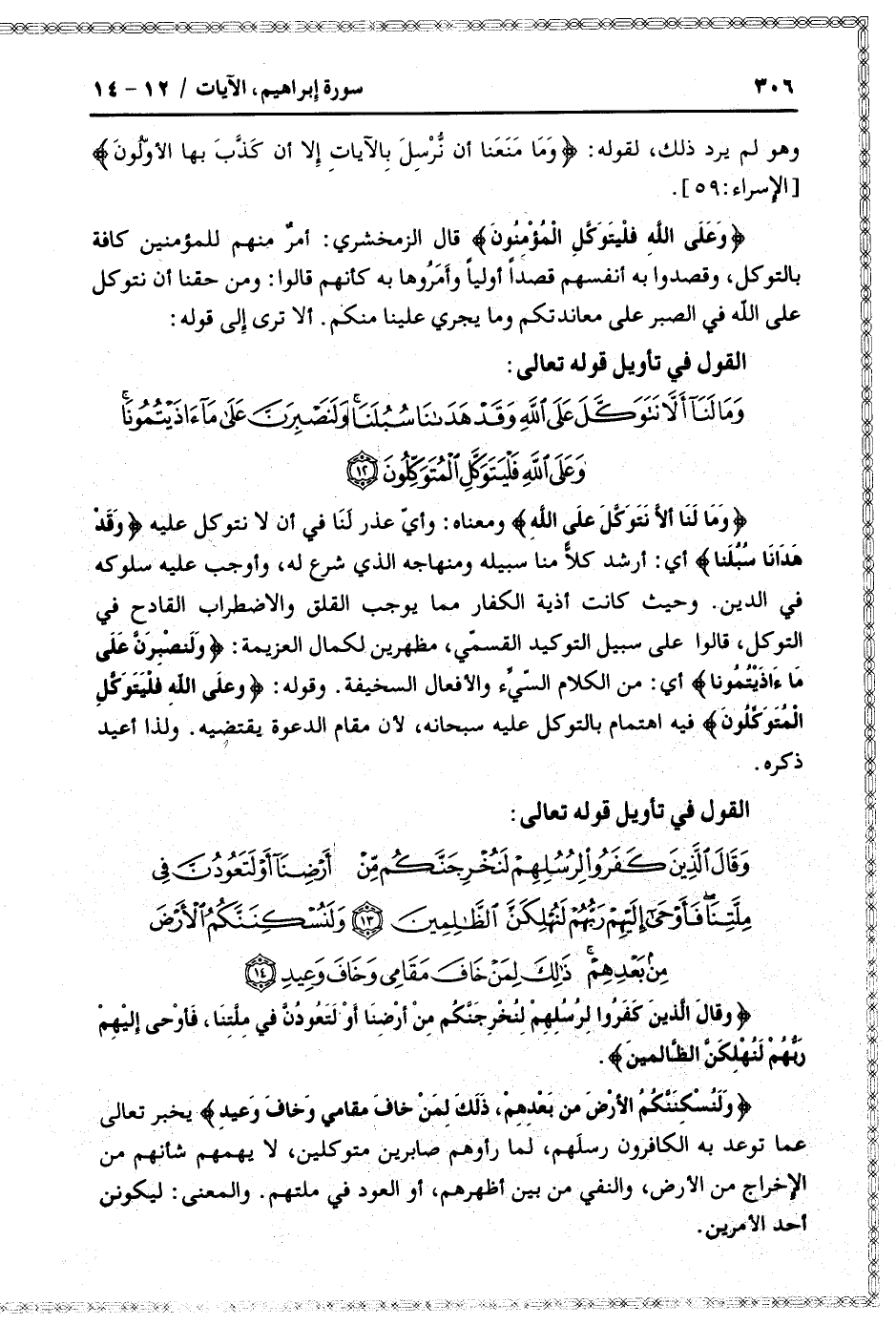 وَلَنُسْكِنَنَّكُمُ الْأَرْضَ مِنْ بَعْدِهِمْ، ذلِكَ لِمَنْ خافَ مَقامِي وَخافَ وَعِيدِ يخبر تعالى عما توعد به الكافرون رسلهم، لما رأوهم صابرين متوكلين، لا يهمهم شأنهم من الإخراج من الأرض، والنفي من بين أظهرهم، أو العود في ملتهم. والمعنى: ليكونن أحد الأمرين.