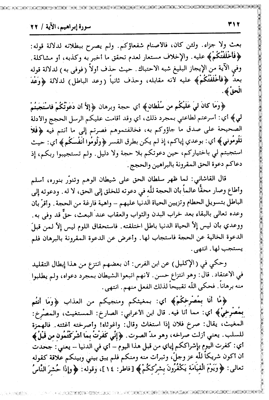 وَما كانَ لِي عَلَيْكُمْ مِنْ سُلْطانٍ أي حجة وبرهان إِلَّا أَنْ دَعَوْتُكُمْ فَاسْتَجَبْتُمْ لِي أي: أسرعتم لطاعتي بمجرد ذلك، أي وقد أقامت عليكم الرسل الحجج والأدلة الصحيحة على صدق ما جاءوكم به، فخالفتموهم فصرتم إلى ما أنتم فيه فَلا تَلُومُونِي أي: بوعدي إياكم، إذ لم يكن بطرق القسر وَلُومُوا أَنْفُسَكُمْ أي: حيث استجبتم لي باختياركم، حين دعوتكم بلا حجة ولا دليل. ولم تستجيبوا ربكم، إذ دعاكم دعوة الحق المقرونة بالبراهين والحجج.