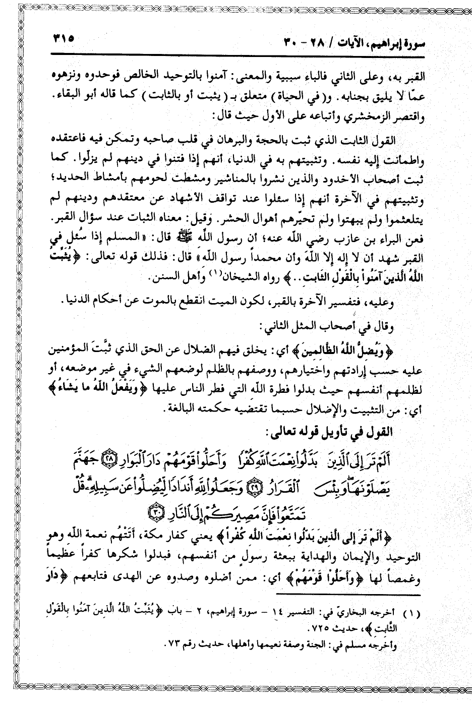 (1) أخرجه البخاريّ في: التفسير 14- سورة إبراهيم، 2- باب يُثَبِّتُ اللَّهُ الَّذِينَ آمَنُوا بِالْقَوْلِ الثَّابِتِ، حديث 725.