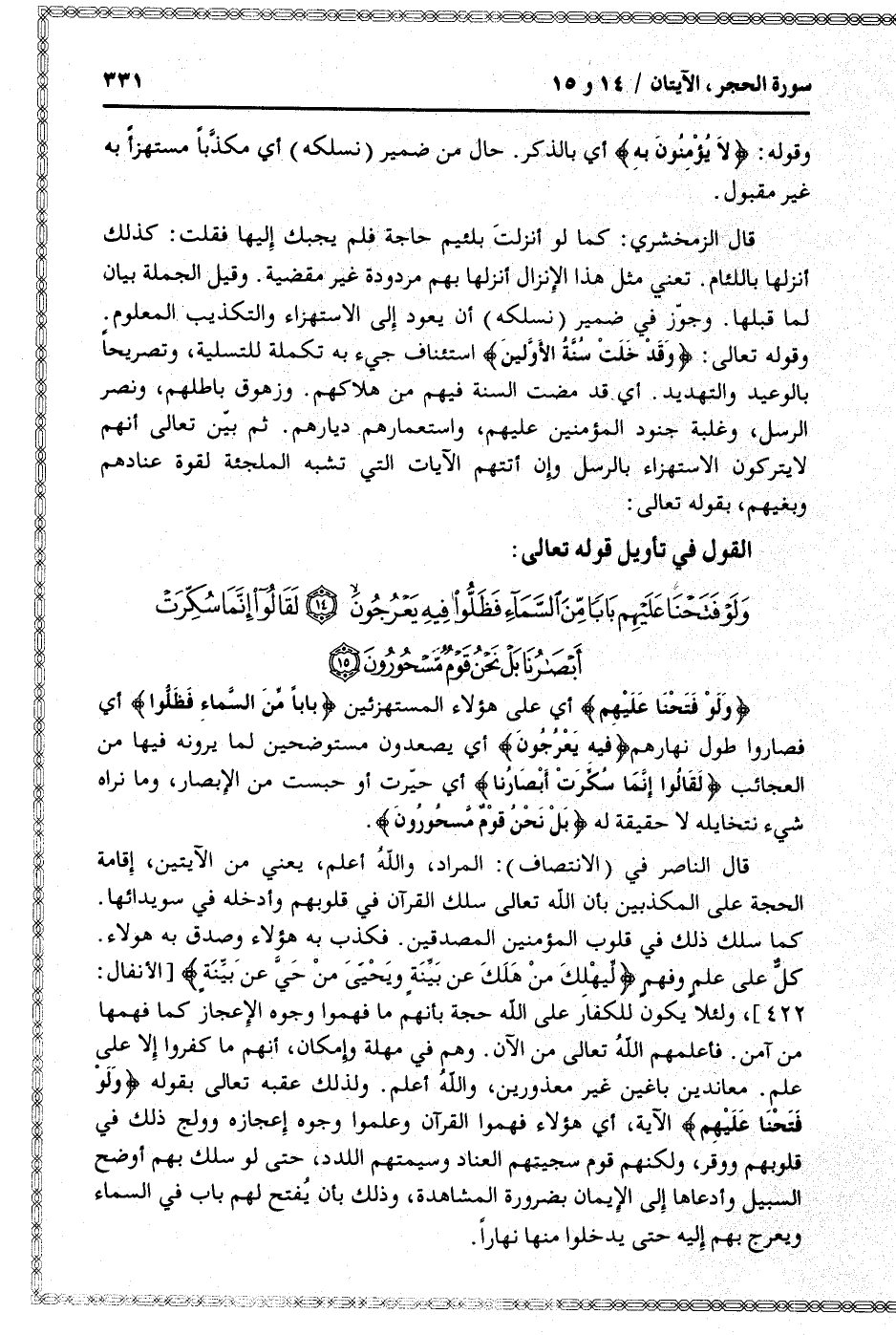 وَلَوْ فَتَحْنا عَلَيْهِمْ باباً مِنَ السَّماءِ فَظَلُّوا فِيهِ يَعْرُجُونَ (14) لَقالُوا إِنَّما سُكِّرَتْ أَبْصارُنا بَلْ نَحْنُ قَوْمٌ مَسْحُورُونَ (15)