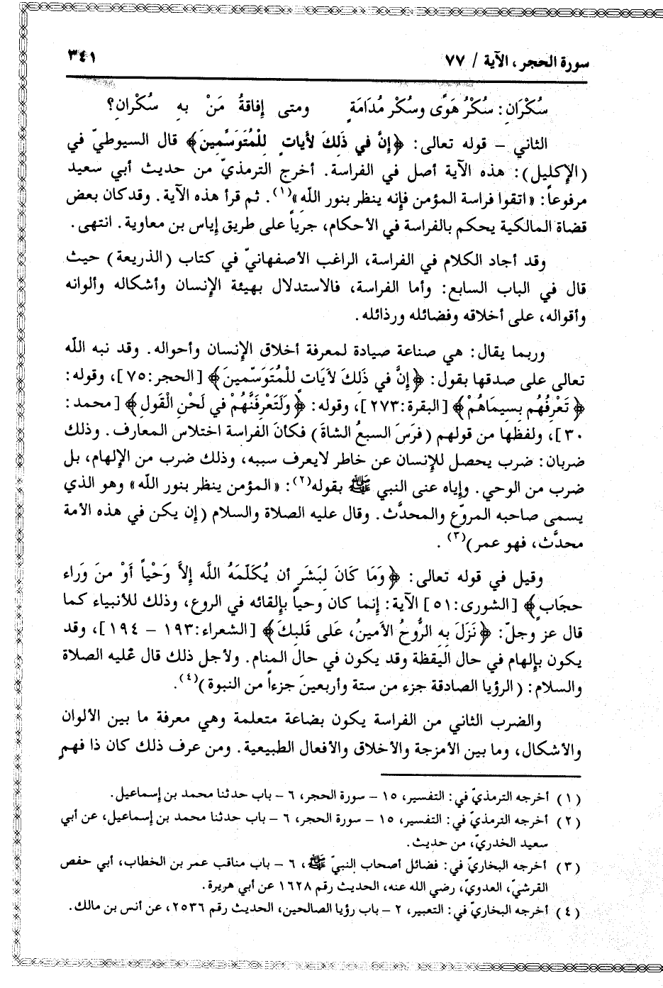 الثاني- قوله تعالى: إِنَّ فِي ذلِكَ لَآياتٍ لِلْمُتَوَسِّمِينَ قال السيوطيّ في (الإكليل) : هذه الآية أصل في الفراسة.