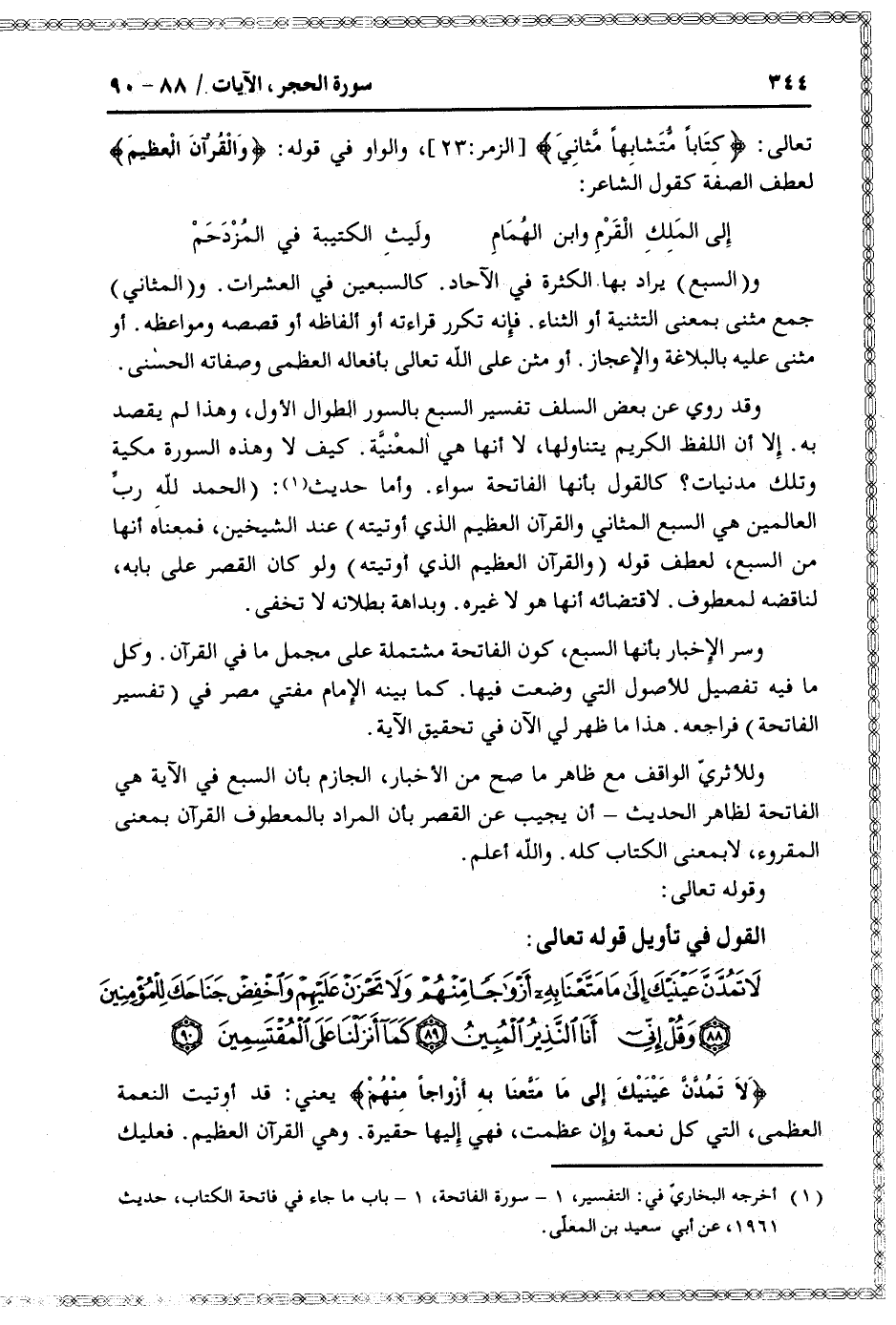 (1) أخرجه البخاريّ في: التفسير، 1- سورة الفاتحة، 1- باب ما جاء في فاتحة الكتاب، حديث 1961، عن أبي سعيد بن المعلّى.