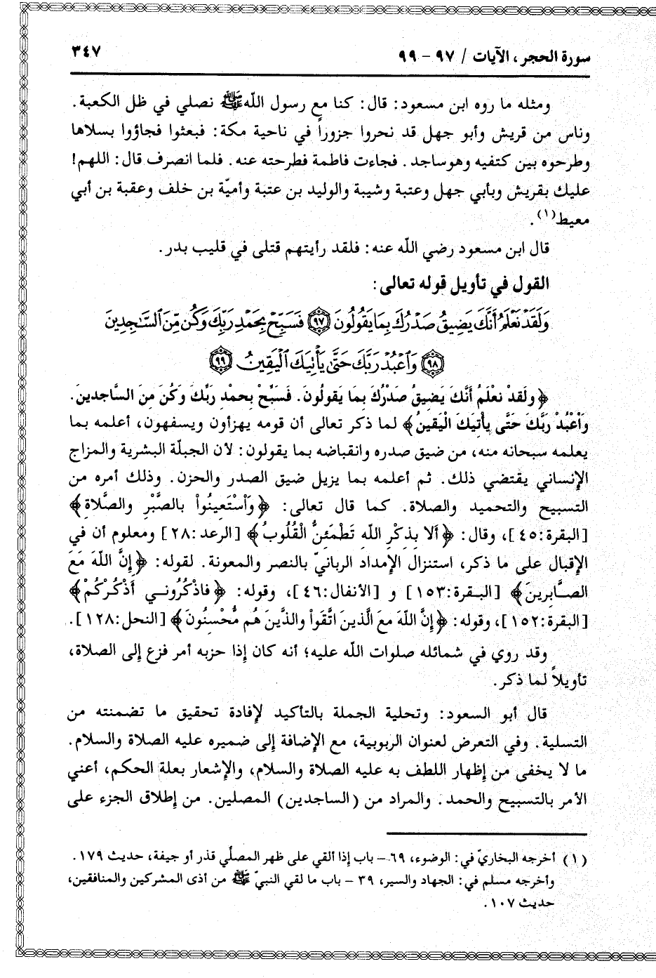 وَلَقَدْ نَعْلَمُ أَنَّكَ يَضِيقُ صَدْرُكَ بِما يَقُولُونَ (97) فَسَبِّحْ بِحَمْدِ رَبِّكَ وَكُنْ مِنَ السَّاجِدِينَ (98) وَاعْبُدْ رَبَّكَ حَتَّى يَأْتِيَكَ الْيَقِينُ (99)