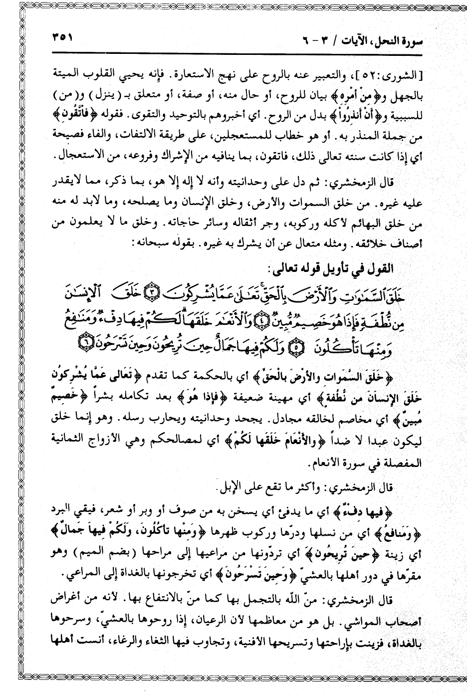 خَلَقَ السَّماواتِ وَالْأَرْضَ بِالْحَقِّ تَعالى عَمَّا يُشْرِكُونَ (3) خَلَقَ الْإِنْسانَ مِنْ نُطْفَةٍ فَإِذا هُوَ خَصِيمٌ مُبِينٌ (4) وَالْأَنْعامَ خَلَقَها لَكُمْ فِيها دِفْءٌ وَمَنافِعُ وَمِنْها تَأْكُلُونَ (5) وَلَكُمْ فِيها جَمالٌ حِينَ تُرِيحُونَ وَحِينَ تَسْرَحُونَ (6)