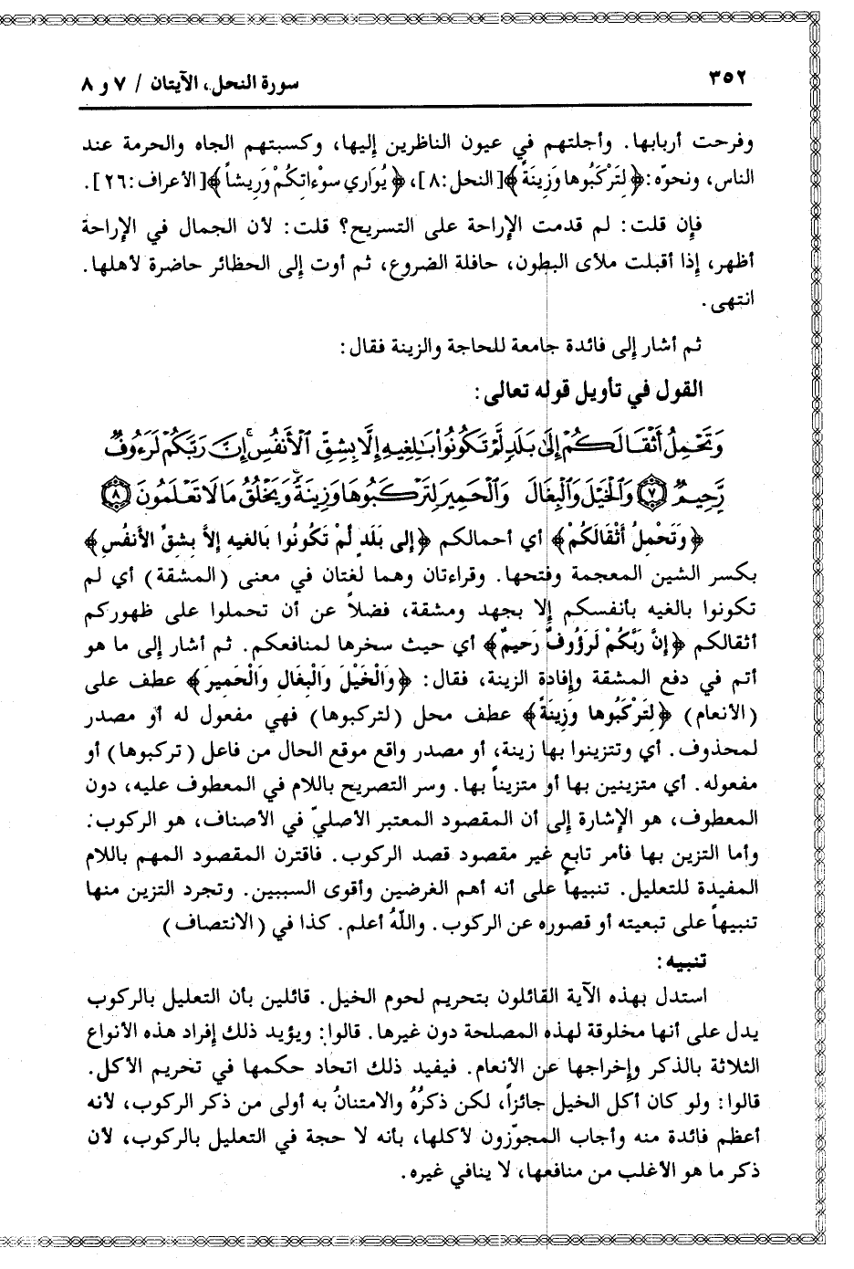 وَتَحْمِلُ أَثْقالَكُمْ أي أحمالكم إِلى بَلَدٍ لَمْ تَكُونُوا بالِغِيهِ إِلَّا بِشِقِّ الْأَنْفُسِ بكسر الشين المعجمة وفتحها. وقراءتان وهما لغتان في معنى (المشقة) أي لم تكونوا بالغيه بأنفسكم إلا بجهد ومشقة، فضلا عن أن تحملوا على ظهوركم أثقالكم إِنَّ رَبَّكُمْ لَرَؤُفٌ رَحِيمٌ أي حيث سخرها لمنافعكم. ثم أشار إلى ما هو أتم في دفع المشقة وإفادة الزينة، فقال: وَالْخَيْلَ وَالْبِغالَ وَالْحَمِيرَ عطف على (الأنعام) لِتَرْكَبُوها وَزِينَةً عطف محل (لتركبوها) فهي مفعول له أو مصدر لمحذوف. أي وتتزينوا بها زينة، أو مصدر واقع موقع الحال من فاعل (تركبوها) أو مفعوله. أي متزينين بها أو متزينا بها. وسر التصريح باللام في المعطوف عليه، دون المعطوف، هو الإشارة إلى أن المقصود المعتبر الأصليّ في الأصناف، هو الركوب: