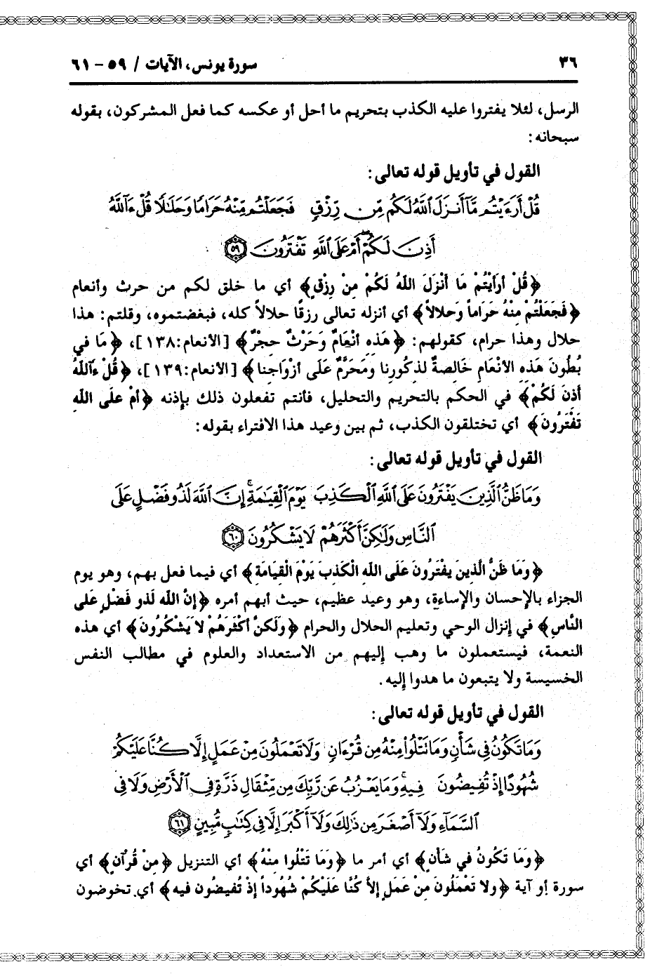 قُلْ أَرَأَيْتُمْ ما أَنْزَلَ اللَّهُ لَكُمْ مِنْ رِزْقٍ فَجَعَلْتُمْ مِنْهُ حَراماً وَحَلالاً قُلْ آللَّهُ أَذِنَ لَكُمْ أَمْ عَلَى اللَّهِ تَفْتَرُونَ (59)