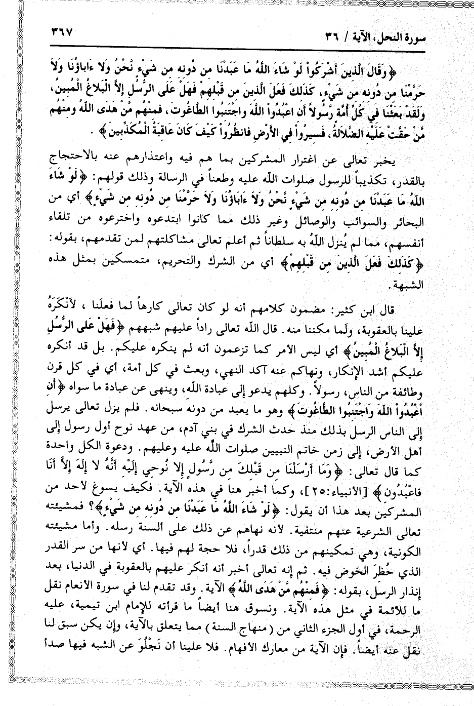 وَقالَ الَّذِينَ أَشْرَكُوا لَوْ شاءَ اللَّهُ ما عَبَدْنا مِنْ دُونِهِ مِنْ شَيْءٍ نَحْنُ وَلا آباؤُنا وَلا حَرَّمْنا مِنْ دُونِهِ مِنْ شَيْءٍ، كَذلِكَ فَعَلَ الَّذِينَ مِنْ قَبْلِهِمْ فَهَلْ عَلَى الرُّسُلِ إِلَّا الْبَلاغُ الْمُبِينُ، وَلَقَدْ بَعَثْنا فِي كُلِّ أُمَّةٍ رَسُولًا أَنِ اعْبُدُوا اللَّهَ وَاجْتَنِبُوا الطَّاغُوتَ، فَمِنْهُمْ مَنْ هَدَى اللَّهُ وَمِنْهُمْ مَنْ حَقَّتْ عَلَيْهِ الضَّلالَةُ، فَسِيرُوا فِي الْأَرْضِ فَانْظُرُوا كَيْفَ كانَ عاقِبَةُ الْمُكَذِّبِينَ.