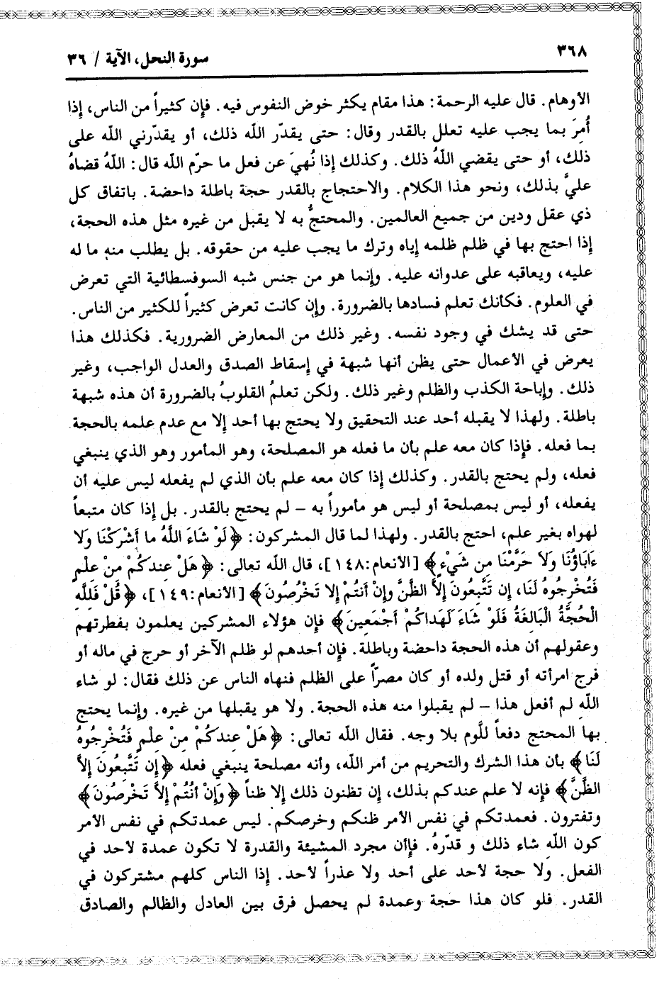 الأوهام. قال عليه الرحمة: هذا مقام يكثر خوض النفوس فيه. فإن كثيرا من الناس، إذا أمر بما يجب عليه تعلل بالقدر وقال: حتى يقدّر الله ذلك، أو يقدّرني الله على ذلك، أو حتى يقضي الله ذلك. وكذلك إذا نهي عن فعل ما حرّم الله قال: الله قضاه عليّ بذلك، ونحو هذا الكلام. والاحتجاج بالقدر حجة باطلة داحضة. باتفاق كل ذي عقل ودين من جميع العالمين. والمحتجّ به لا يقبل من غيره مثل هذه الحجة، إذا احتج بها في ظلم ظلمه إياه وترك ما يجب عليه من حقوقه. بل يطلب منه ما له عليه، ويعاقبه على عدوانه عليه. وإنما هو من جنس شبه السوفسطائية التي تعرض في العلوم. فكأنك تعلم فسادها بالضرورة. وإن كانت تعرض كثيرا للكثير من الناس.