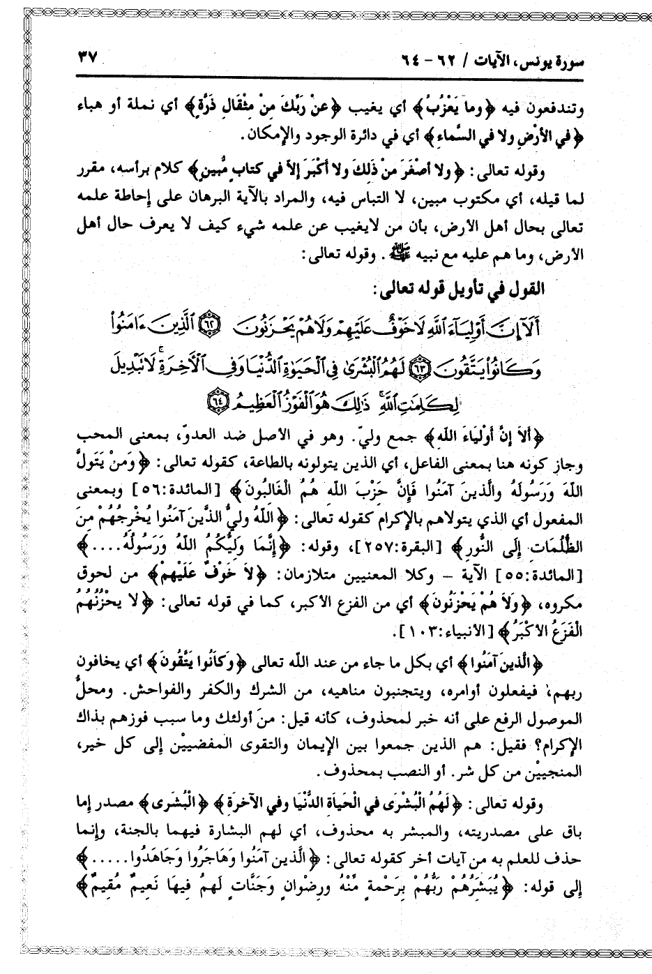 أَلا إِنَّ أَوْلِياءَ اللَّهِ لا خَوْفٌ عَلَيْهِمْ وَلا هُمْ يَحْزَنُونَ (62) الَّذِينَ آمَنُوا وَكانُوا يَتَّقُونَ (63) لَهُمُ الْبُشْرى فِي الْحَياةِ الدُّنْيا وَفِي الْآخِرَةِ لا تَبْدِيلَ لِكَلِماتِ اللَّهِ ذلِكَ هُوَ الْفَوْزُ الْعَظِيمُ (64)