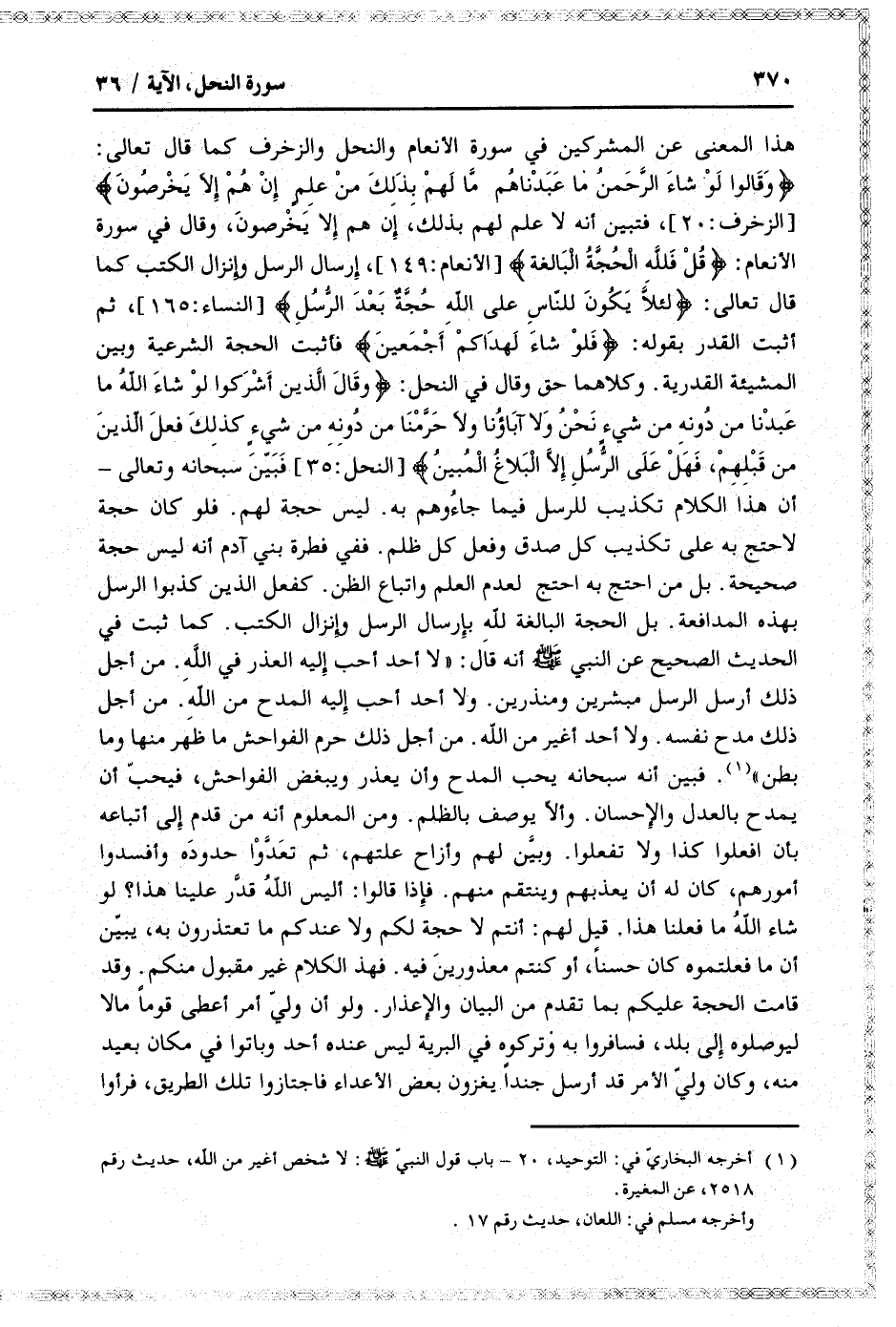 وَقالُوا لَوْ شاءَ الرَّحْمنُ ما عَبَدْناهُمْ ما لَهُمْ بِذلِكَ مِنْ عِلْمٍ إِنْ هُمْ إِلَّا يَخْرُصُونَ [الزخرف: 20] ، فتبين أنه لا علم لهم بذلك، إن هم إلا يخرصون، وقال في سورة الأنعام: قُلْ فَلِلَّهِ الْحُجَّةُ الْبالِغَةُ [الأنعام: 149] ، إرسال الرسل وإنزال الكتب كما قال تعالى: لِئَلَّا يَكُونَ لِلنَّاسِ عَلَى اللَّهِ حُجَّةٌ بَعْدَ الرُّسُلِ [النساء: 165] ، ثم أثبت القدر بقوله: فَلَوْ شاءَ لَهَداكُمْ أَجْمَعِينَ فأثبت الحجة الشرعية وبين المشيئة القدرية. وكلاهما حق وقال في النحل: وَقالَ الَّذِينَ أَشْرَكُوا لَوْ شاءَ اللَّهُ ما عَبَدْنا مِنْ دُونِهِ مِنْ شَيْءٍ نَحْنُ وَلا آباؤُنا وَلا حَرَّمْنا مِنْ دُونِهِ مِنْ شَيْءٍ كَذلِكَ فَعَلَ الَّذِينَ مِنْ قَبْلِهِمْ، فَهَلْ عَلَى الرُّسُلِ إِلَّا الْبَلاغُ الْمُبِينُ [النحل: 35] فبيّن سبحانه وتعالى- أن هذا الكلام تكذيب للرسل فيما جاءوهم به. ليس حجة لهم. فلو كان حجة لاحتج به على تكذيب كل صدق وفعل كل ظلم. ففي فطرة بني آدم أنه ليس حجة صحيحة. بل من احتج به احتج لعدم العلم واتباع الظن. كفعل الذين كذبوا الرسل بهذه المدافعة. بل الحجة البالغة لله بإرسال الرسل وإنزال الكتب. كما