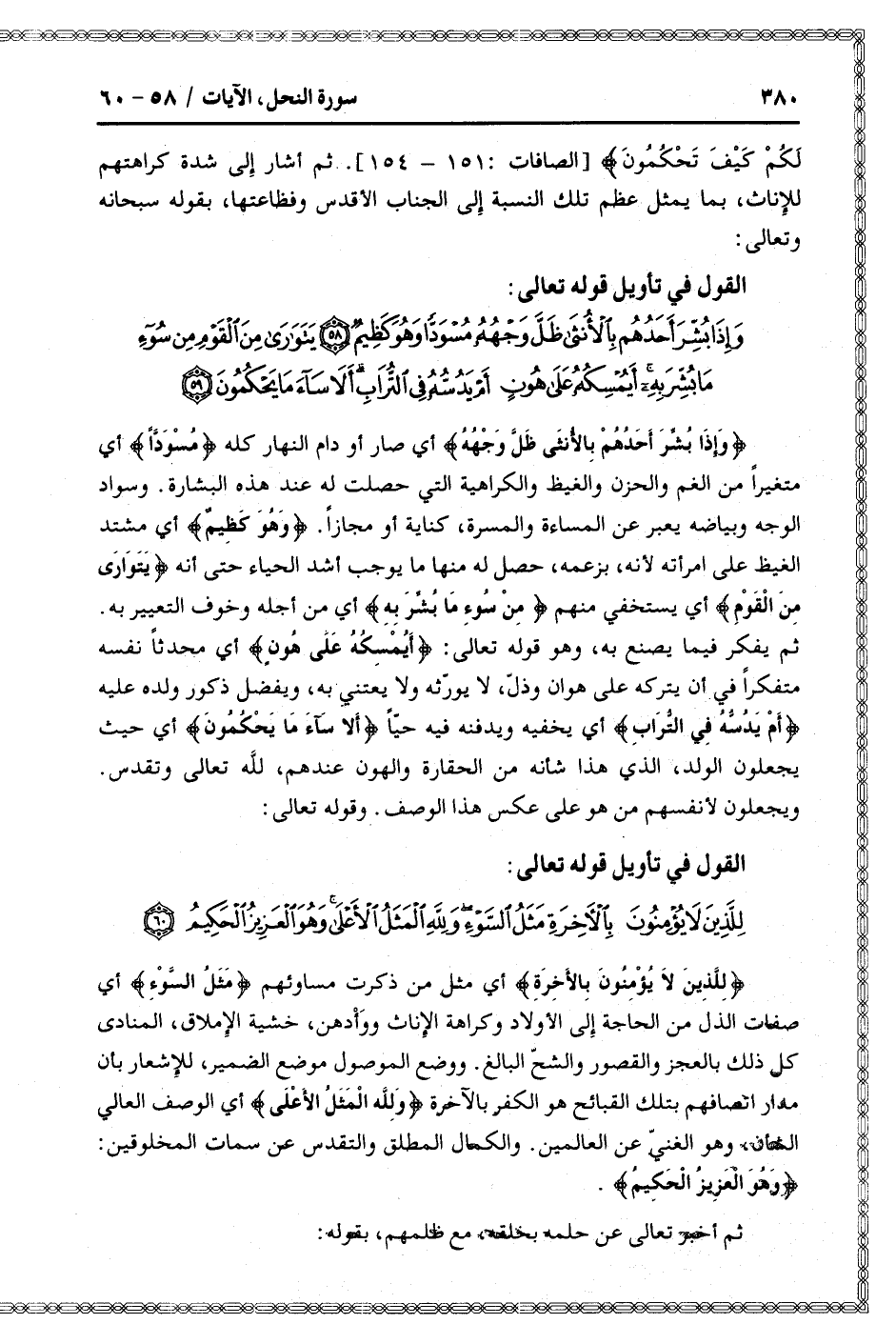 وَإِذا بُشِّرَ أَحَدُهُمْ بِالْأُنْثى ظَلَّ وَجْهُهُ أي صار أو دام النهار كله مُسْوَدًّا أي متغيرا من الغم والحزن والغيظ والكراهية التي حصلت له عند هذه البشارة. وسواد الوجه وبياضه يعبر عن المساءة والمسرة، كناية أو مجازا. وَهُوَ كَظِيمٌ أي مشتد الغيظ على امرأته لأنه، بزعمه، حصل له منها ما يوجب أشد الحياء حتى أنه يَتَوارى مِنَ الْقَوْمِ أي يستخفي منهم مِنْ سُوءِ ما بُشِّرَ بِهِ أي من أجله وخوف التعبير به.