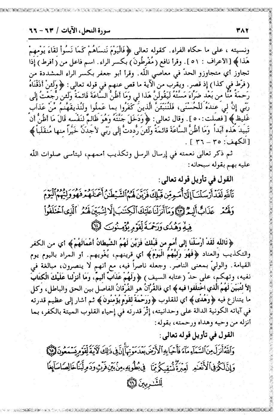تَاللَّهِ لَقَدْ أَرْسَلْنا إِلى أُمَمٍ مِنْ قَبْلِكَ فَزَيَّنَ لَهُمُ الشَّيْطانُ أَعْمالَهُمْ فَهُوَ وَلِيُّهُمُ الْيَوْمَ وَلَهُمْ عَذابٌ أَلِيمٌ (63) وَما أَنْزَلْنا عَلَيْكَ الْكِتابَ إِلاَّ لِتُبَيِّنَ لَهُمُ الَّذِي اخْتَلَفُوا فِيهِ وَهُدىً وَرَحْمَةً لِقَوْمٍ يُؤْمِنُونَ (64)