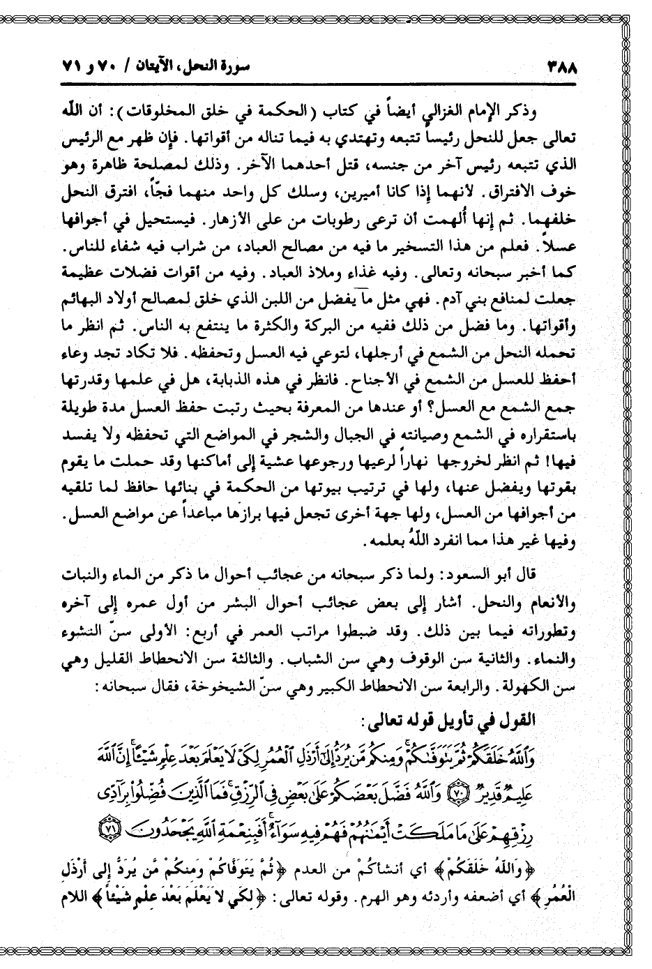 قال أبو السعود: ولما ذكر سبحانه من عجائب أحوال ما ذكر من الماء والنبات والأنعام والنحل. أشار إلى بعض عجائب أحوال البشر من أول عمره إلى آخره وتطوراته فيما بين ذلك. وقد ضبطوا مراتب العمر في أربع: الأولى سنّ النشوء والنماء. والثانية سن الوقوف وهي سن الشباب. والثالثة سن الانحطاط القليل وهي سن الكهولة. والرابعة سن الانحطاط الكبير وهي سنّ الشيخوخة، فقال سبحانه: