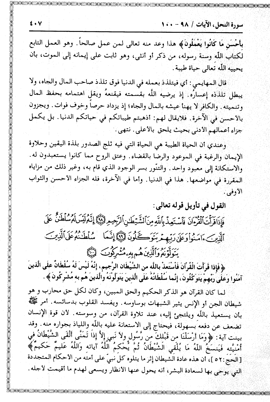 فَإِذا قَرَأْتَ الْقُرْآنَ فَاسْتَعِذْ بِاللَّهِ مِنَ الشَّيْطانِ الرَّجِيمِ (98) إِنَّهُ لَيْسَ لَهُ سُلْطانٌ عَلَى الَّذِينَ آمَنُوا وَعَلى رَبِّهِمْ يَتَوَكَّلُونَ (99) إِنَّما سُلْطانُهُ عَلَى الَّذِينَ يَتَوَلَّوْنَهُ وَالَّذِينَ هُمْ بِهِ مُشْرِكُونَ (100)
