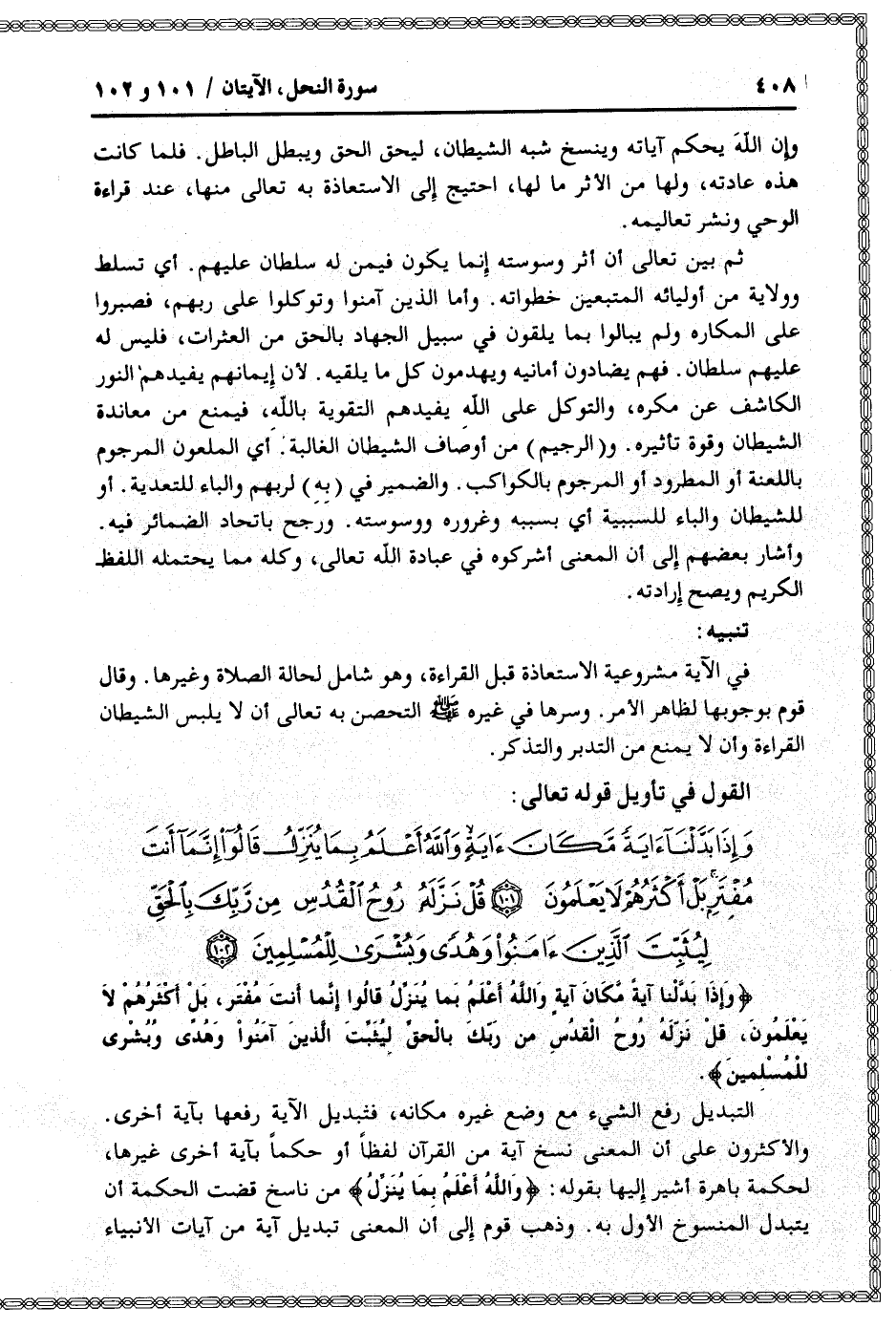 وَإِذا بَدَّلْنا آيَةً مَكانَ آيَةٍ وَاللَّهُ أَعْلَمُ بِما يُنَزِّلُ قالُوا إِنَّما أَنْتَ مُفْتَرٍ، بَلْ أَكْثَرُهُمْ لا يَعْلَمُونَ، قُلْ نَزَّلَهُ رُوحُ الْقُدُسِ مِنْ رَبِّكَ بِالْحَقِّ لِيُثَبِّتَ الَّذِينَ آمَنُوا وَهُدىً وَبُشْرى لِلْمُسْلِمِينَ.