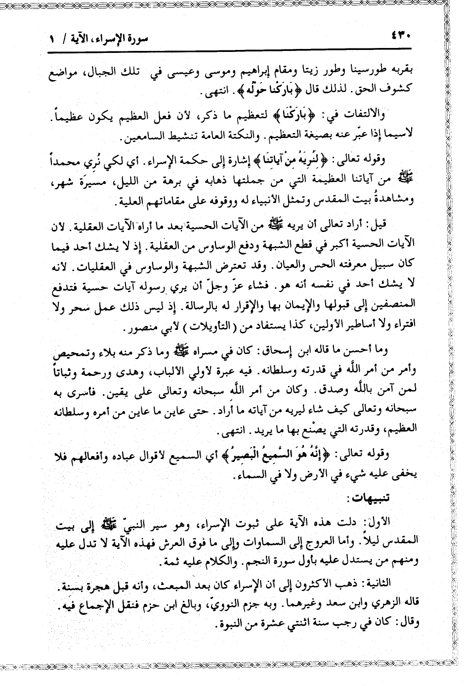 الأول: دلت هذه الآية على ثبوت الإسراء، وهو سير النبيّ صلى الله عليه وسلم إلى بيت المقدس ليلا. وأما العروج إلى السماوات وإلى ما فوق العرش فهذه الآية لا تدل عليه ومنهم من يستدل عليه بأول سورة النجم. والكلام عليه ثمة.