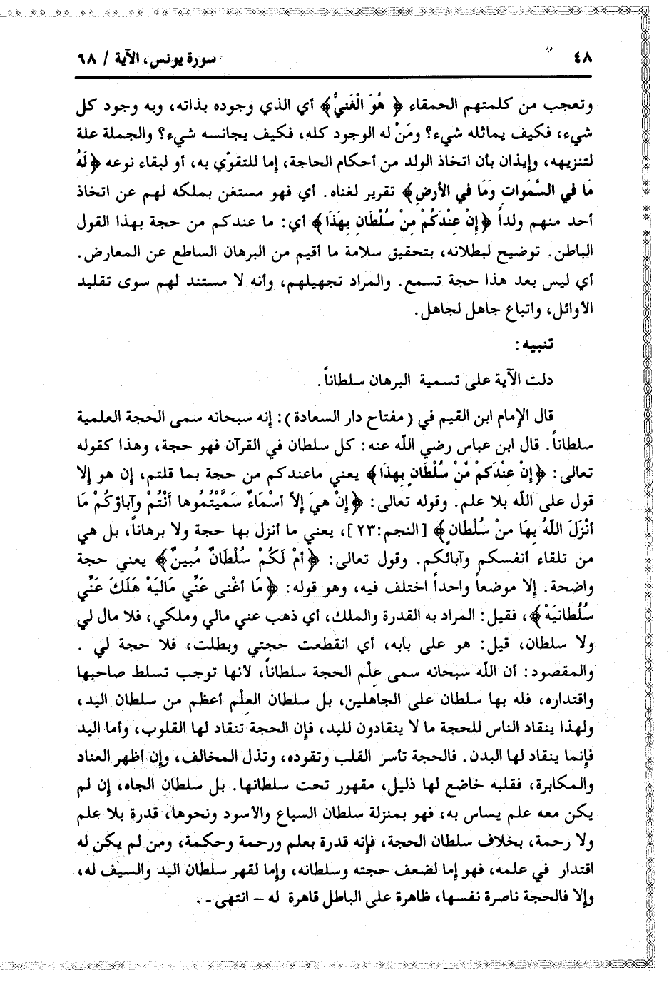 قال الإمام ابن القيم في (مفتاح دار السعادة) : إنه سبحانه سمى الحجة العلمية سلطانا. قال ابن عباس رضي الله عنه: كل سلطان في القرآن فهو حجة، وهذا كقوله تعالى: إِنْ عِنْدَكُمْ مِنْ سُلْطانٍ بِهذا يعني ما عندكم من حجة بما قلتم، إن هو إلا قول على الله بلا علم. وقوله تعالى: إِنْ هِيَ إِلَّا أَسْماءٌ سَمَّيْتُمُوها أَنْتُمْ وَآباؤُكُمْ ما أَنْزَلَ اللَّهُ بِها مِنْ سُلْطانٍ [النجم: 23] ، يعني ما أنزل بها حجة ولا برهانا، بل هي من تلقاء أنفسكم وآبائكم. وقول تعالى: أَمْ لَكُمْ سُلْطانٌ مُبِينٌ يعني حجة واضحة. إلا موضعا واحدا اختلف فيه، وهو قوله: ما أَغْنى عَنِّي مالِيَهْ هَلَكَ عَنِّي سُلْطانِيَهْ، فقيل: المراد به القدرة والملك، أي ذهب عني مالي وملكي، فلا مال لي ولا سلطان، قيل: هو على بابه، أي انقطعت حجتي وبطلت، فلا حجة لي.