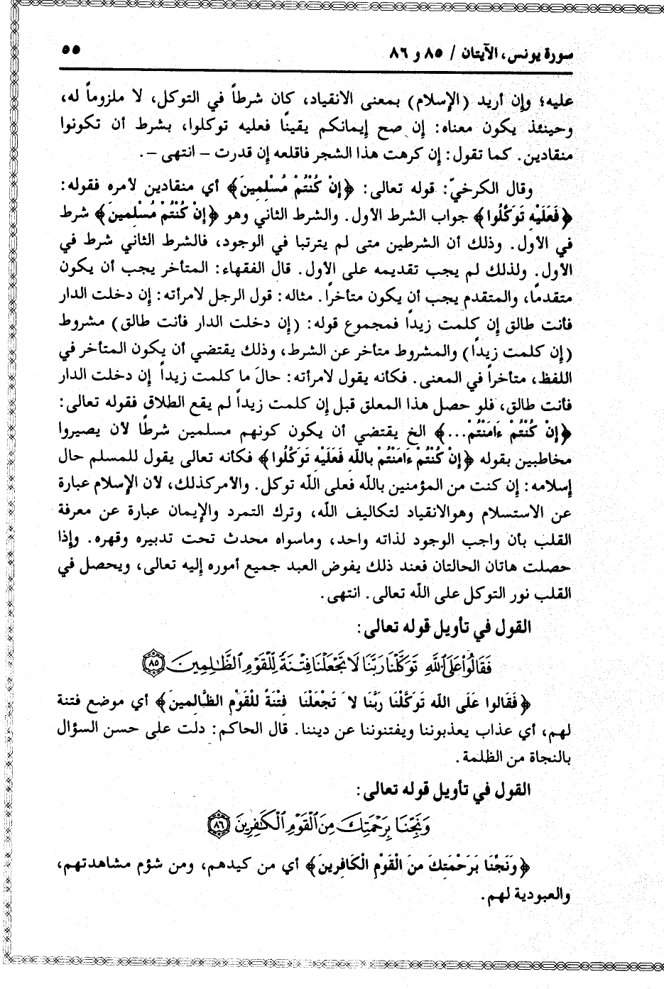 فَعَلَيْهِ تَوَكَّلُوا جواب الشرط الأول. والشرط الثاني وهو إِنْ كُنْتُمْ مُسْلِمِينَ شرط في الأول. وذلك أن الشرطين متى لم يترتبا في الوجود، فالشرط الثاني شرط في الأول. ولذلك لم يجب تقديمه على الأول. قال الفقهاء: المتأخر يجب أن يكون متقدما، والمتقدم يجب أن يكون متأخرا. مثاله: قول الرجل لامرأته: إن دخلت الدار فأنت طالق إن كلمت زيدا فمجموع قوله: (إن دخلت الدار فأنت طالق) مشروط (إن كلمت زيدا) والمشروط متأخر عن الشرط، وذلك يقتضي أن يكون المتأخر في اللفظ، متأخرا في المعنى. فكأنه يقول لامرأته: حال ما كلمت زيدا إن دخلت الدار فأنت طالق، فلو حصل هذا المعلق قبل إن كلمت زيدا لم يقع لم يقع الطلاق فقوله تعالى:
