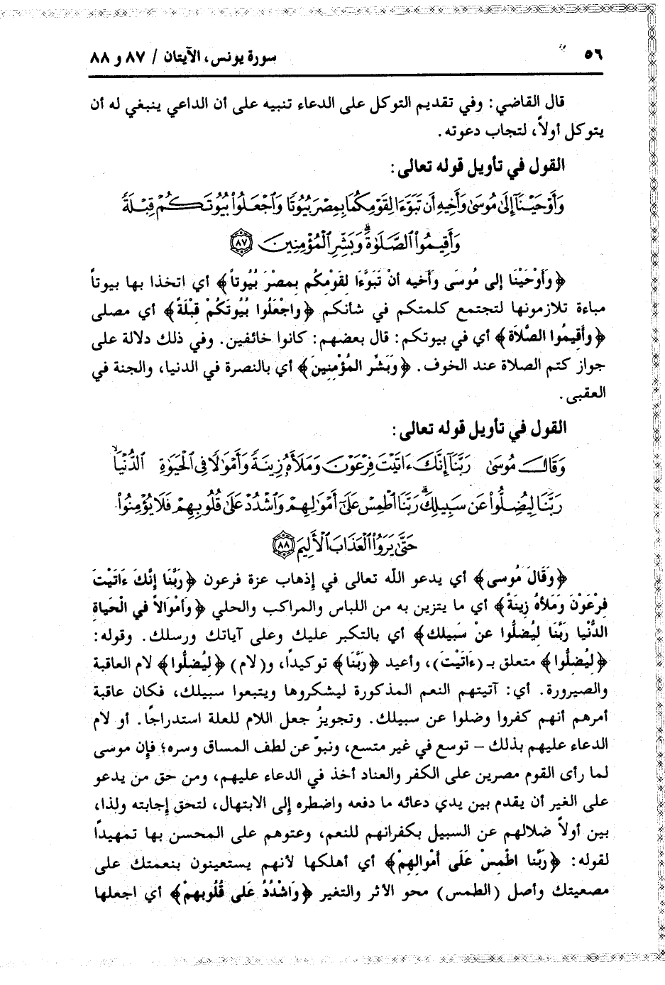 وَأَوْحَيْنا إِلى مُوسى وَأَخِيهِ أَنْ تَبَوَّءا لِقَوْمِكُما بِمِصْرَ بُيُوتاً أي اتخذا بها بيوتا مباءة تلازمونها لتجتمع كلمتكم في شأنكم وَاجْعَلُوا بُيُوتَكُمْ قِبْلَةً أي مصلى وَأَقِيمُوا الصَّلاةَ أي في بيوتكم: قال بعضهم: كانوا خائفين. وفي ذلك دلالة على جواز كتم الصلاة عند الخوف. وَبَشِّرِ الْمُؤْمِنِينَ أي بالنصرة في الدنيا، والجنة في العقبى.