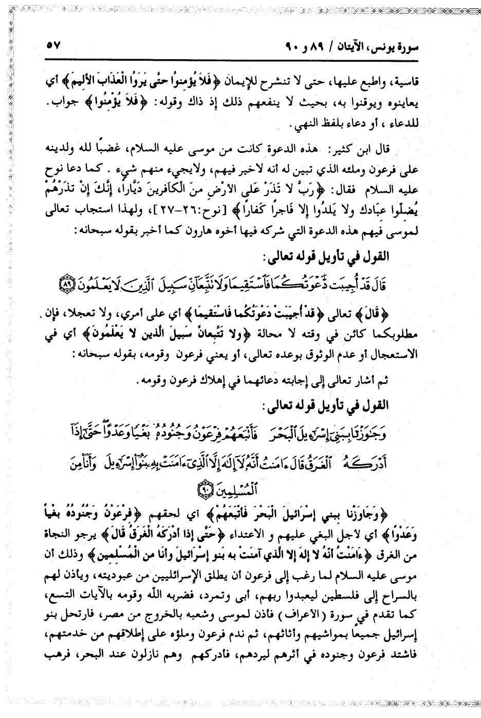 وَجاوَزْنا بِبَنِي إِسْرائِيلَ الْبَحْرَ فَأَتْبَعَهُمْ فِرْعَوْنُ وَجُنُودُهُ بَغْياً وَعَدْواً حَتَّى إِذا أَدْرَكَهُ الْغَرَقُ قالَ آمَنْتُ أَنَّهُ لا إِلهَ إِلاَّ الَّذِي آمَنَتْ بِهِ بَنُوا إِسْرائِيلَ وَأَنَا مِنَ الْمُسْلِمِينَ (90)