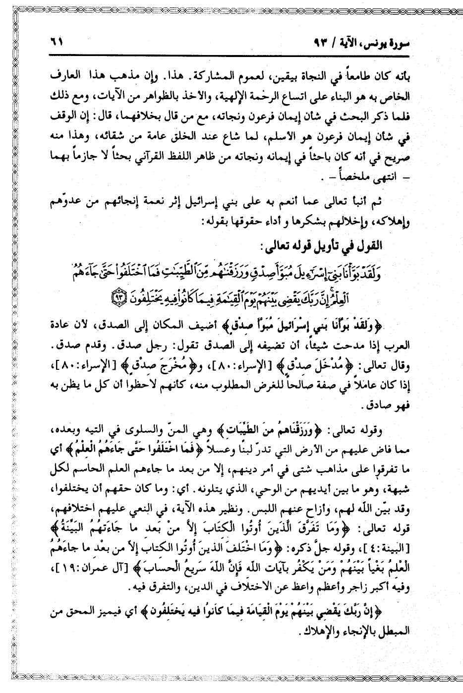وَلَقَدْ بَوَّأْنا بَنِي إِسْرائِيلَ مُبَوَّأَ صِدْقٍ وَرَزَقْناهُمْ مِنَ الطَّيِّباتِ فَمَا اخْتَلَفُوا حَتَّى جاءَهُمُ الْعِلْمُ إِنَّ رَبَّكَ يَقْضِي بَيْنَهُمْ يَوْمَ الْقِيامَةِ فِيما كانُوا فِيهِ يَخْتَلِفُونَ (93)