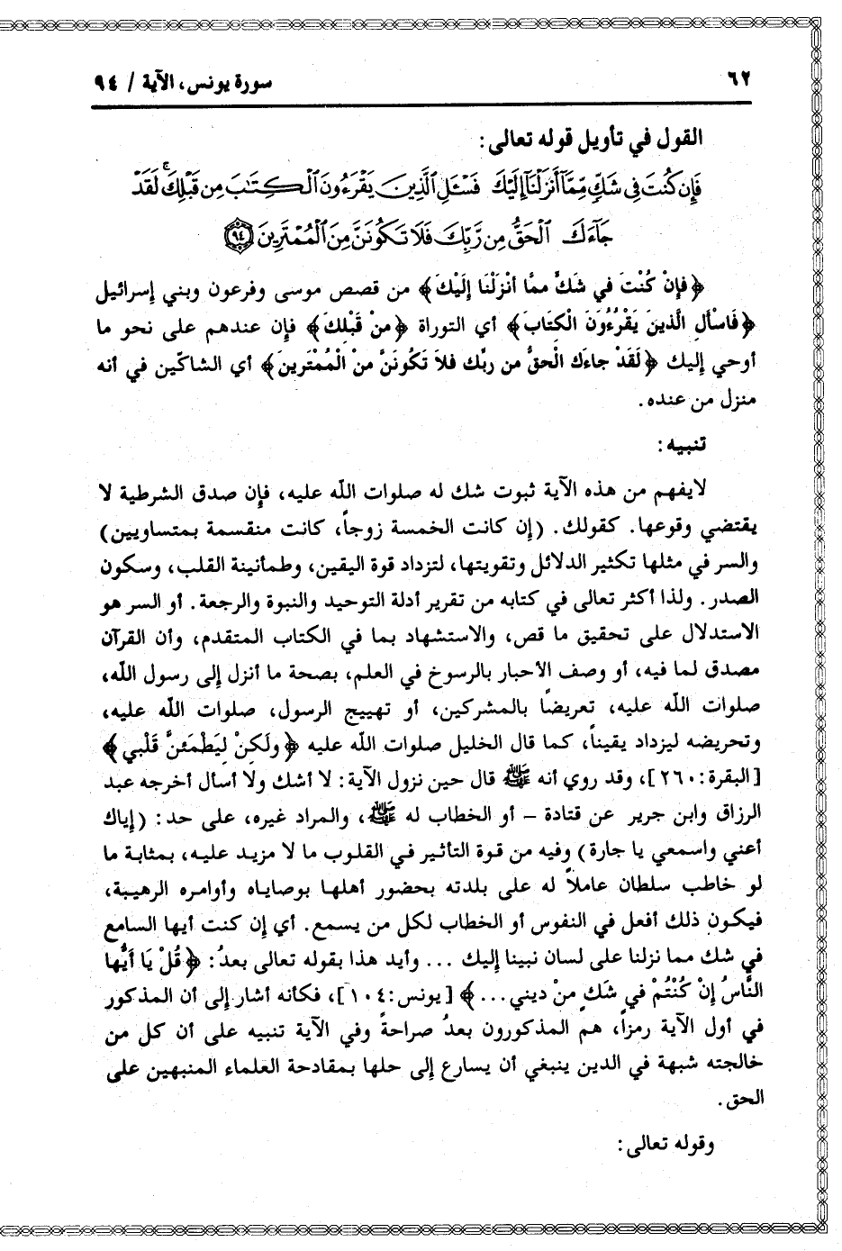 فَإِنْ كُنْتَ فِي شَكٍّ مِمَّا أَنْزَلْنا إِلَيْكَ فَسْئَلِ الَّذِينَ يَقْرَؤُنَ الْكِتابَ مِنْ قَبْلِكَ لَقَدْ جاءَكَ الْحَقُّ مِنْ رَبِّكَ فَلا تَكُونَنَّ مِنَ المُمْتَرِينَ (94)