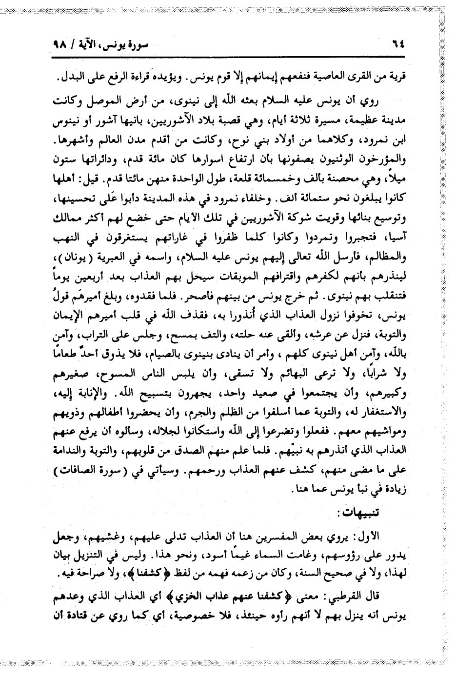 والمؤرخون الوثنيون يصفونها بأن ارتفاع اسوارها كان مائة قدم، ودائراتها ستون ميلا، وهي محصنة بألف وخمسمائة قلعة، طول الواحدة منهن مائتا قدم. قيل: أهلها كانوا يبلغون نحو ستمائة ألف. وخلفاء نمرود في هذه المدينة دأبوا على تحسينها، وتوسيع بنائها وقويت شوكة الآشوريين في تلك الأيام حتى خضع لهم أكثر ممالك آسيا، فتجبروا وتمردوا وكانوا كلما ظفروا في غاراتهم يستغرقون في النهب والمظالم، فأرسل الله تعالى إليهم يونس عليه السلام، واسمه في العبرية (يونان) ، لينذرهم بأنهم لكفرهم واقترافهم الموبقات سيحل بهم العذاب بعد أربعين يوما فتنقلب بهم نينوى. ثم خرج يونس من بينهم فأصحر. فلما فقدوه، وبلغ أميرهم قول يونس، تخوفوا نزول العذاب الذي أنذروا به، فقذف الله في قلب أميرهم الإيمان والتوبة، فنزل عن عرشه، وألقى عنه حلته، والتف بمسح، وجلس على التراب، وآمن بالله، وآمن أهل نينوى كلهم، وأمر أن ينادى بنينوى بالصيام، فلا يذوق أحد طعاما ولا شرابا، ولا ترعى البهائم ولا تسقى، وأن يلبس الناس المسوح، صغيرهم وكبيرهم، وأن يجتمعوا في صعيد واحد، يجهرون بتسبيح الله. والإنابة إليه، والاستغفار له، والتوبة عما أسلفوا من الظلم والجرم، وأن يحضروا أطفالهم وذويهم ومواشيهم معهم. ففعلوا وتضرعوا إلى الله واستكانوا لجلاله، وسألوه أن يرفع عنهم العذاب الذي أنذرهم به نبيّهم. فلما علم منهم الصدق من قلوبهم، والتوبة والندامة على ما مضى منهم، كشف عنهم العذاب ورحمهم. وسيأتي في (سورة الصافات) زيادة في نبأ يونس عما هنا.