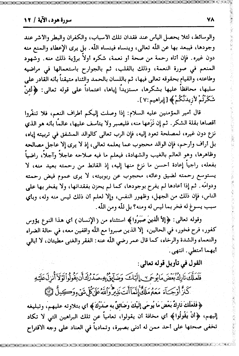 فَلَعَلَّكَ تارِكٌ بَعْضَ ما يُوحى إِلَيْكَ وَضائِقٌ بِهِ صَدْرُكَ أَنْ يَقُولُوا لَوْلا أُنْزِلَ عَلَيْهِ كَنْزٌ أَوْ جاءَ مَعَهُ مَلَكٌ إِنَّما أَنْتَ نَذِيرٌ وَاللَّهُ عَلى كُلِّ شَيْءٍ وَكِيلٌ (12)