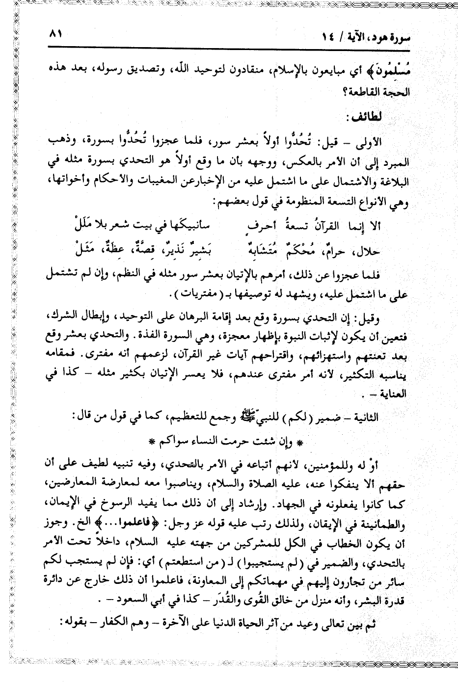 الأولى- قيل: تحدّوا أولا بعشر سور، فلما عجزوا تحدّوا بسورة، وذهب المبرد إلى أن الأمر بالعكس، ووجهه بأن ما وقع أولا هو التحدي بسورة مثله في البلاغة والاشتمال على ما اشتمل عليه من الإخبار عن المغيبات والأحكام وأخواتها، وهي الأنواع التسعة المنظومة في قول بعضهم: