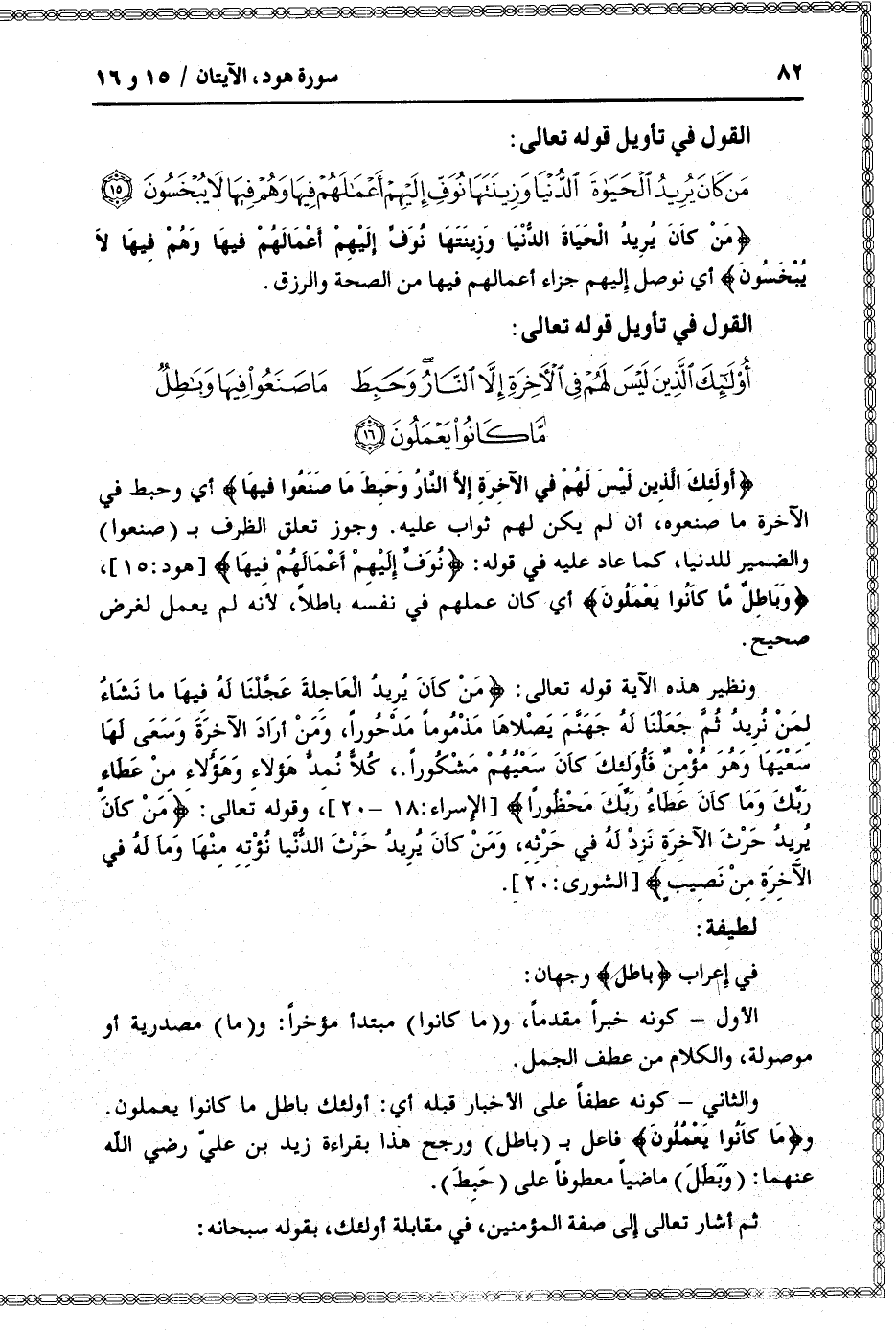 أُولئِكَ الَّذِينَ لَيْسَ لَهُمْ فِي الْآخِرَةِ إِلَّا النَّارُ وَحَبِطَ ما صَنَعُوا فِيها أي وحبط في الآخرة ما صنعوه، أن لم يكن لهم ثواب عليه. وجوز تعلق الظرف ب (صنعوا) والضمير للدنيا، كما عاد عليه في قوله: نُوَفِّ إِلَيْهِمْ أَعْمالَهُمْ فِيها [هود: 15] ، وَباطِلٌ ما كانُوا يَعْمَلُونَ أي كان عملهم في نفسه باطلا، لأنه لم يعمل لغرض صحيح.