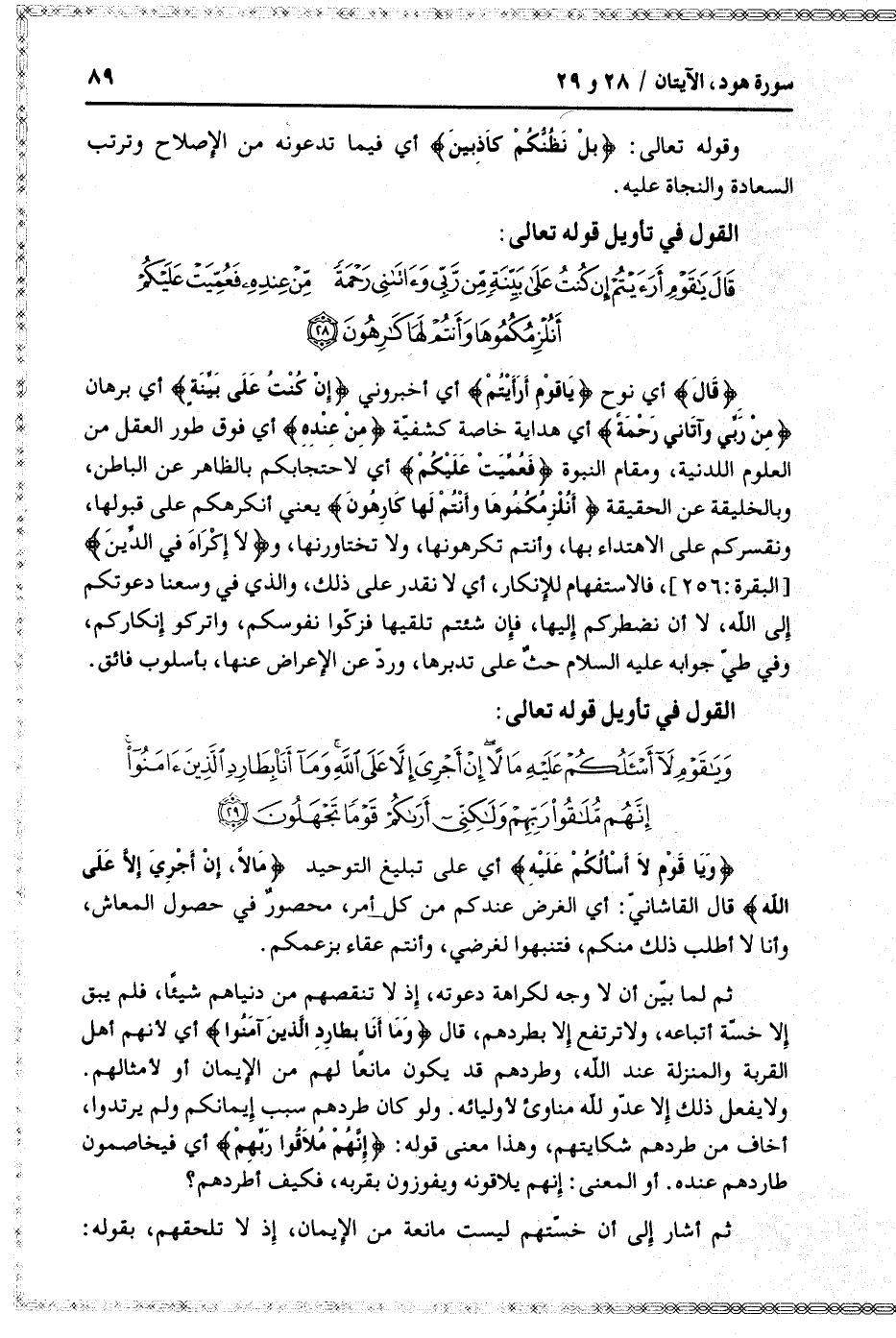 وَيا قَوْمِ لا أَسْئَلُكُمْ عَلَيْهِ مالاً إِنْ أَجرِيَ إِلاَّ عَلَى اللَّهِ وَما أَنَا بِطارِدِ الَّذِينَ آمَنُوا إِنَّهُمْ مُلاقُوا رَبِّهِمْ وَلكِنِّي أَراكُمْ قَوْماً تَجْهَلُونَ (29)