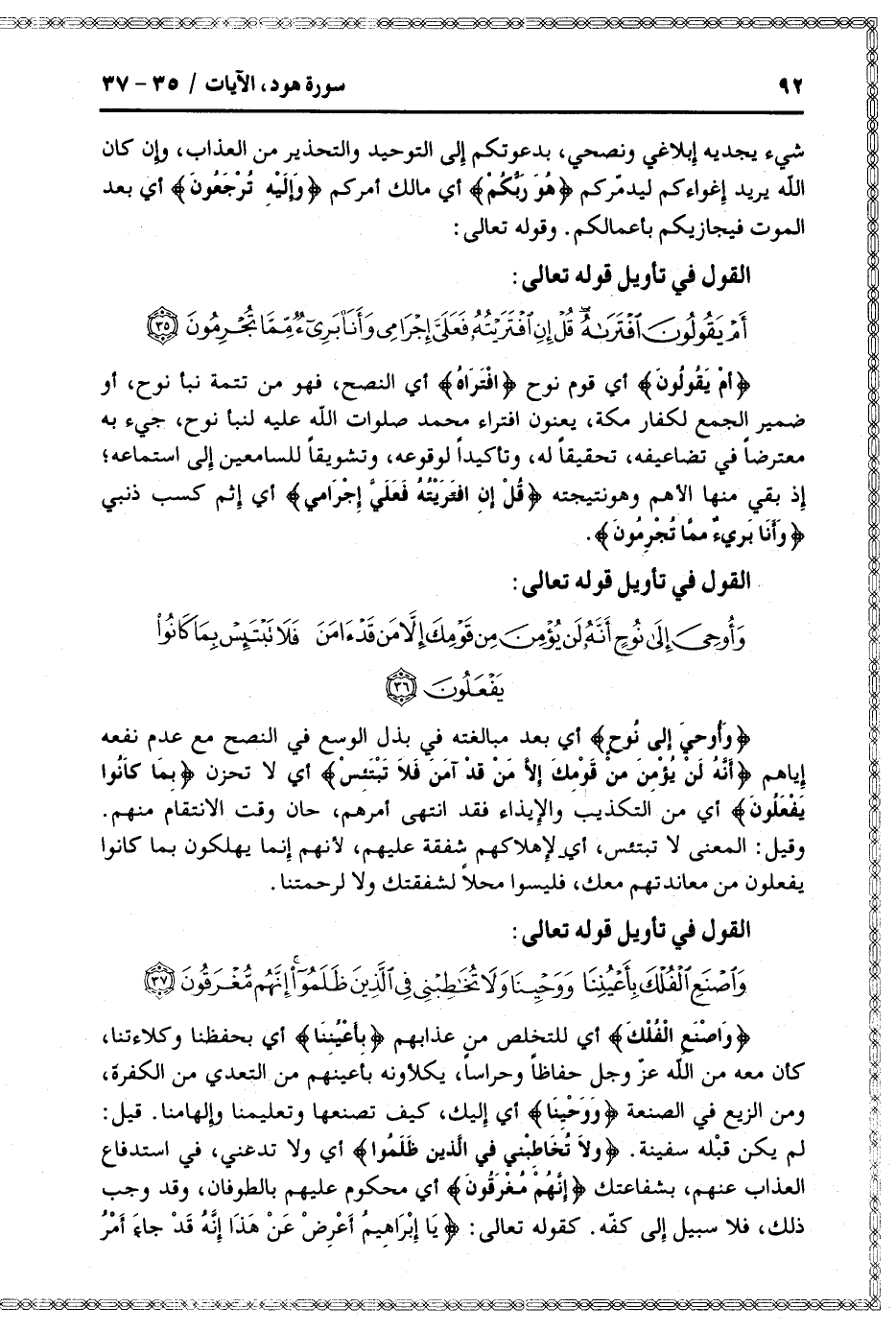 لم يكن قبله سفينة. وَلا تُخاطِبْنِي فِي الَّذِينَ ظَلَمُوا أي ولا تدعني، في استدفاع العذاب عنهم، بشفاعتك إِنَّهُمْ مُغْرَقُونَ أي محكوم عليهم بالطوفان، وقد وجب ذلك، فلا سبيل إلى كفّه. كقوله تعالى: يا إِبْراهِيمُ أَعْرِضْ عَنْ هذا إِنَّهُ قَدْ جاءَ أَمْرُ